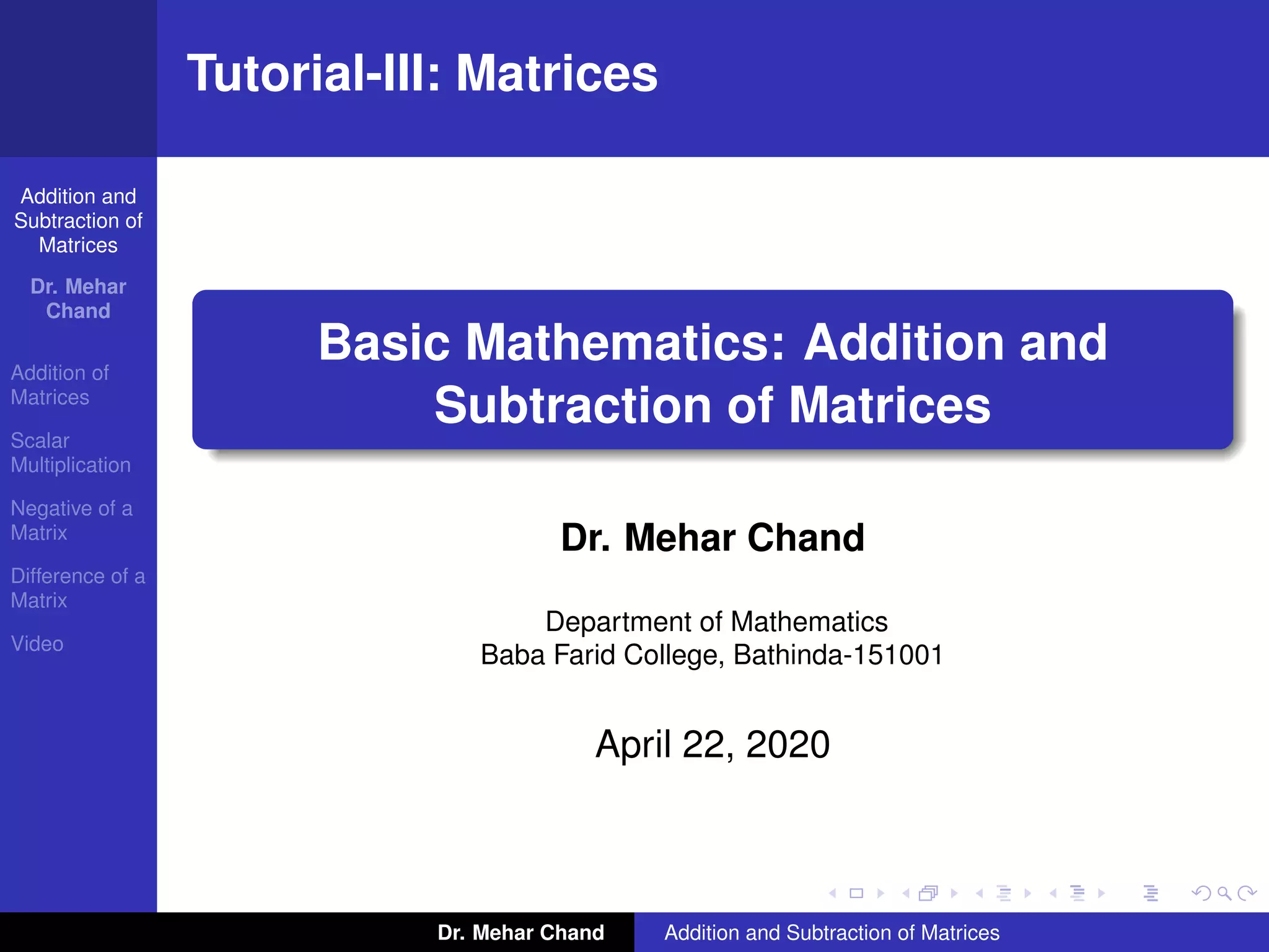 This document is a lecture by Dr. Mehar Chand on the topics of addition and subtraction of matrices. It defines addition of matrices as combining matrices of the same order by adding corresponding elements. Scalar multiplication is defined as multiplying every element of a matrix by a scalar or number. The negative of a matrix is defined as multiplying every element by -1. Difference of matrices is defined as subtracting corresponding elements of matrices of the same order. The document provides definitions and examples for each topic and concludes by providing a link to a full video lecture on the subject.