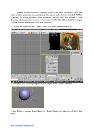 Dokumen ini adalah tutorial tentang cara membuat gambar planet Bumi dan Bulan menggunakan aplikasi desain grafis 3D, Autodesk 3D Max 9. Langkah-langkah mencakup pembuatan objek bola untuk Bumi dan Bulan, pengaturan material menggunakan bitmap, penempatan cahaya, dan proses rendering untuk menghasilkan gambar akhir. Setelah mengikuti semua langkah, pengguna dapat menyimpan hasilnya dalam format gambar seperti .jpg atau .bmp.