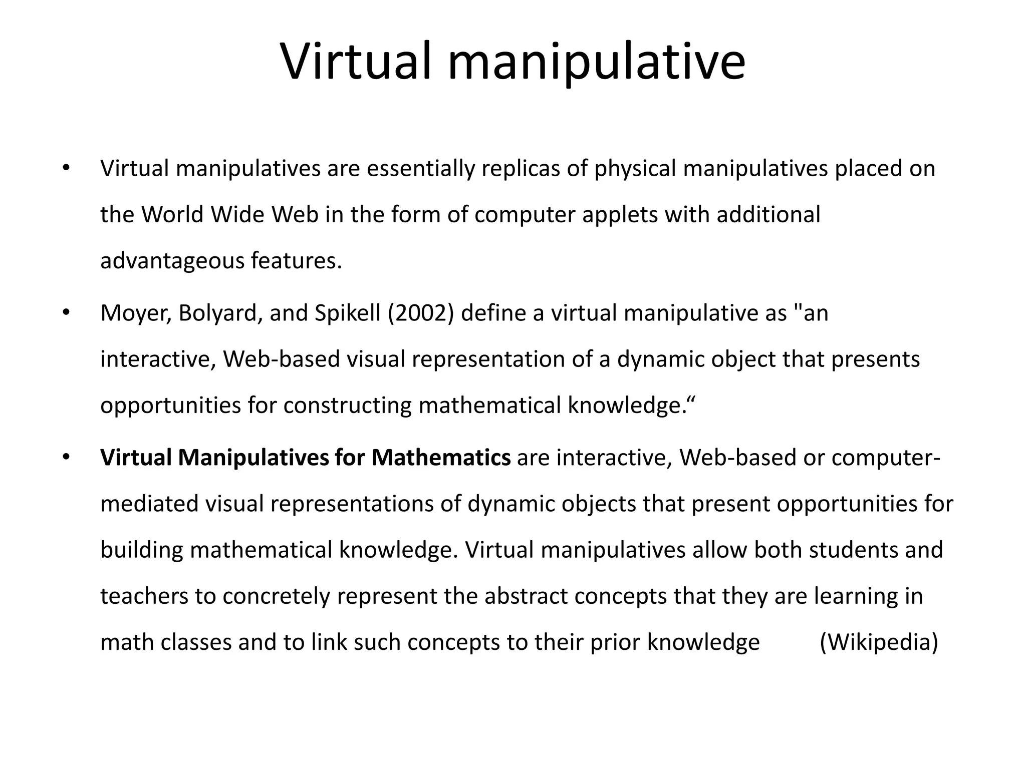 This document discusses virtual manipulatives, which are computer-based replicas of physical math manipulatives that can be used online. Virtual manipulatives allow students to interact with dynamic representations of objects to build math knowledge and link concepts to prior learning. They are modeled after physical manipulatives like blocks, coins, and shapes. Research suggests virtual manipulatives may help students develop deeper understandings of concepts compared to physical ones alone. The document also compares features of physical and virtual manipulatives.