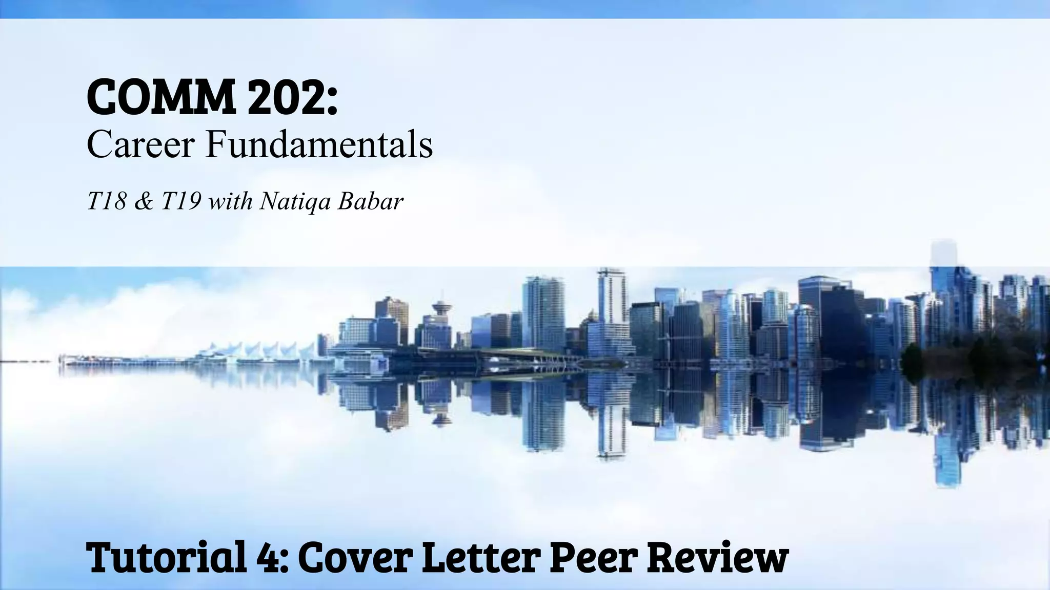 This document provides an agenda and instructions for a career fundamentals tutorial focusing on cover letters and resume peer review. The timeline outlines upcoming due dates including submitting a resume and cover letter draft. Sections cover resume branding, formatting checks for resumes and cover letters, and how to provide feedback to peers. Students are instructed to trade and review each other's documents, checking for errors in formatting, consistency, order and content. The goal is to improve documents before the next deadline.