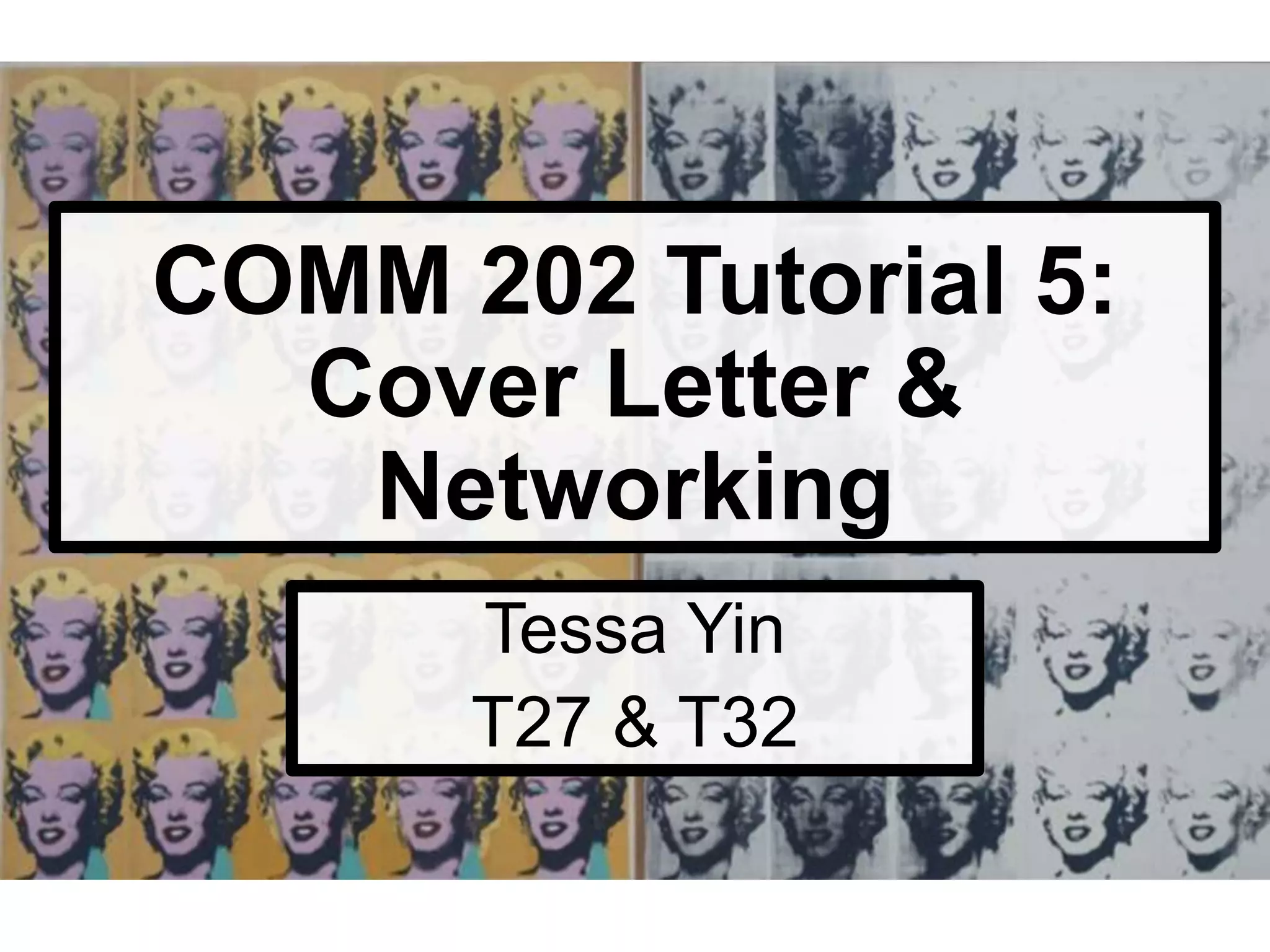 This document provides an agenda and information for a COMM 202 tutorial on cover letters, networking, and building relationships. The tutorial covers formatting and components of a strong cover letter, networking best practices such as preparation, conversation topics, and follow-up. It also outlines the course timeline and assignments, including a cover letter draft, resume and cover letter assignment, informational interview reflection, and networking reflection. Key action items are identified and questions from students are solicited at the end.