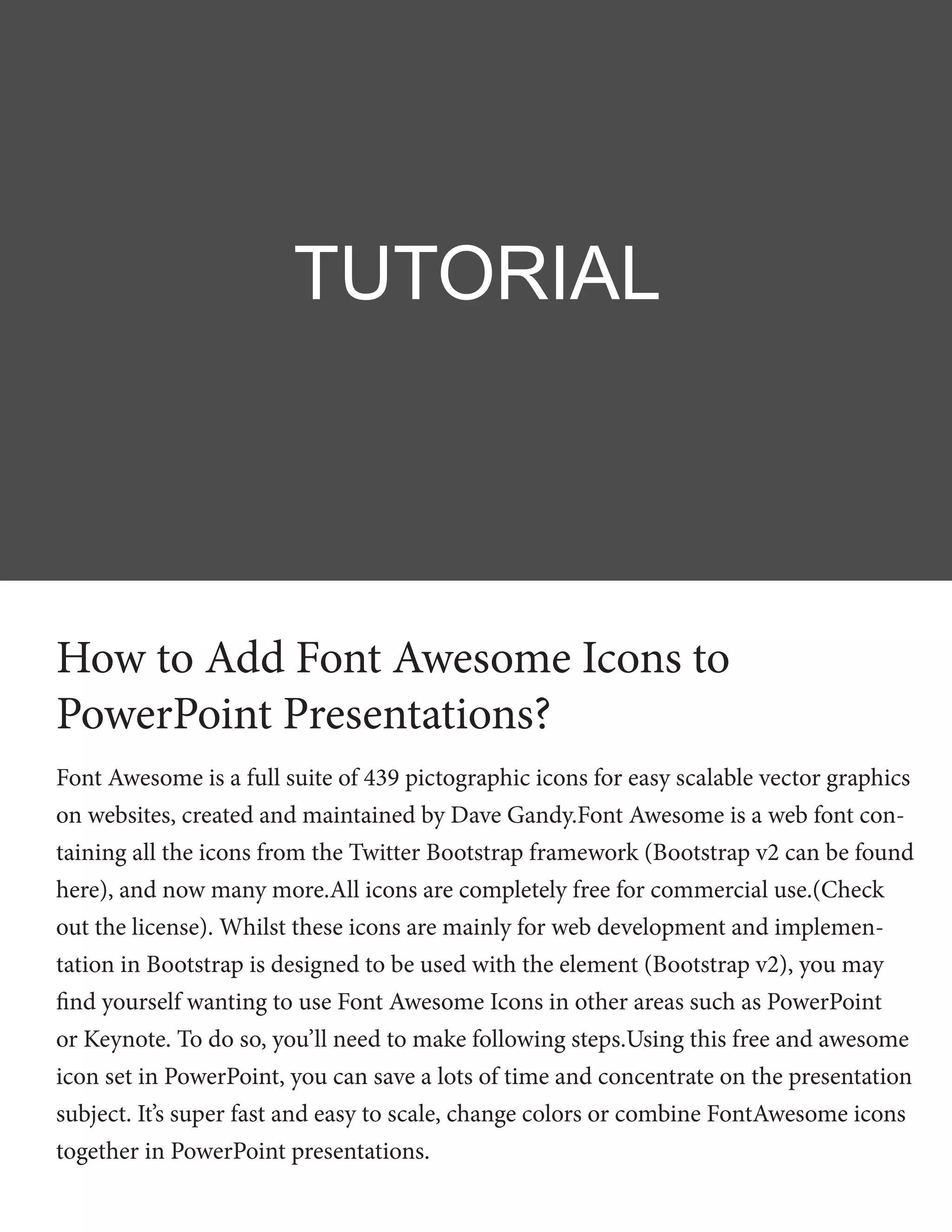 This document provides instructions for adding Font Awesome icons to PowerPoint presentations. It explains that Font Awesome is a suite of 439 vector icons that are free to use commercially. To use the icons in PowerPoint, you need to download and install the Font Awesome font, then copy icons from the cheatsheet webpage and paste them into PowerPoint slides. The pasted icons can then be formatted and styled within PowerPoint. Using Font Awesome icons can enhance presentations and make infographic design easier.