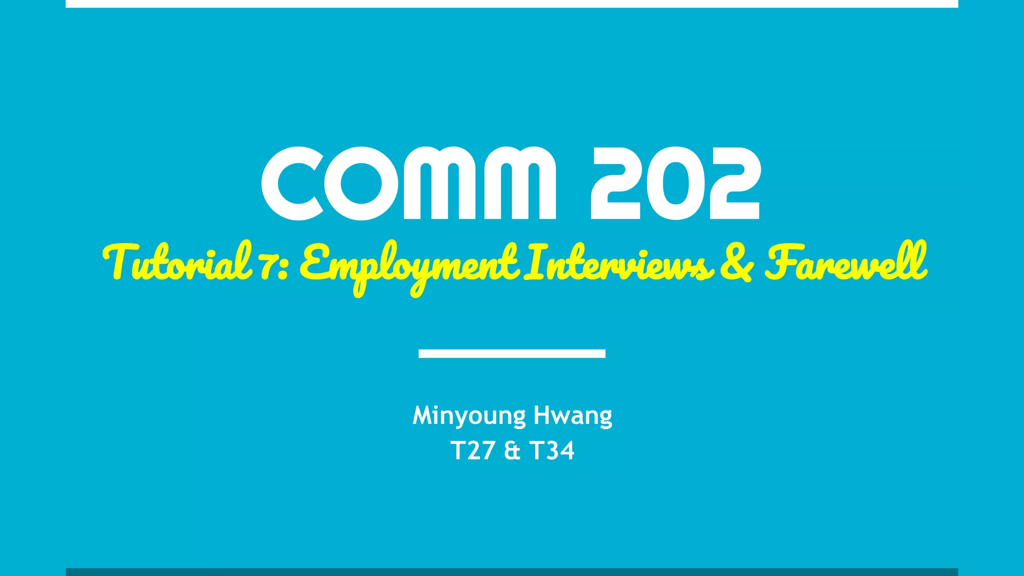 This document provides information and guidance for an upcoming employment interview tutorial and assignment. It outlines the agenda which includes a discussion of employment interviews, sample interview questions and answers, and closing messages. Students are instructed to sign up for and complete a mandatory employment interview during the following week which will be graded and make up 25% of their mark. Tips are provided on how to prepare for, conduct themselves during, and follow up after the interview.