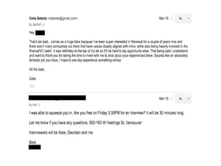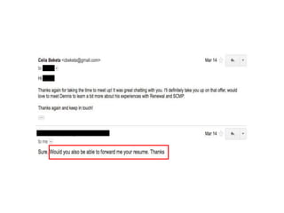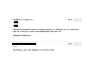 This document provides an agenda and timeline for a networking tutorial. It outlines the steps students will take to network, including attending a networking event, conducting an informational interview, and following up with contacts. The timeline specifies that over several weeks students will prepare for the networking event, attend the event, complete a reflection, request informational interviews, conduct the interviews, and submit a final assignment. The document also provides tips on networking best practices like following up after meetings, requesting informational interviews, and keeping contacts updated after initial connections.