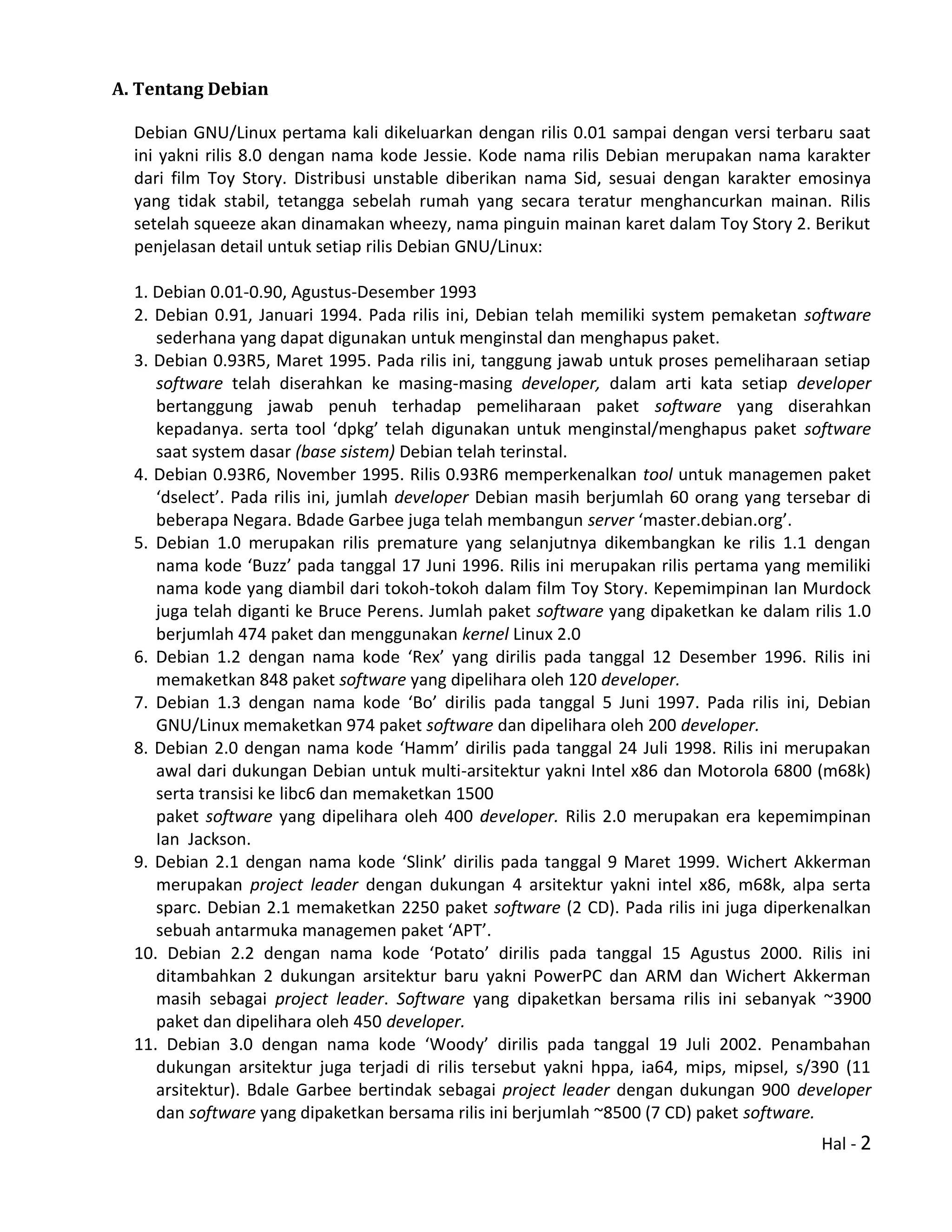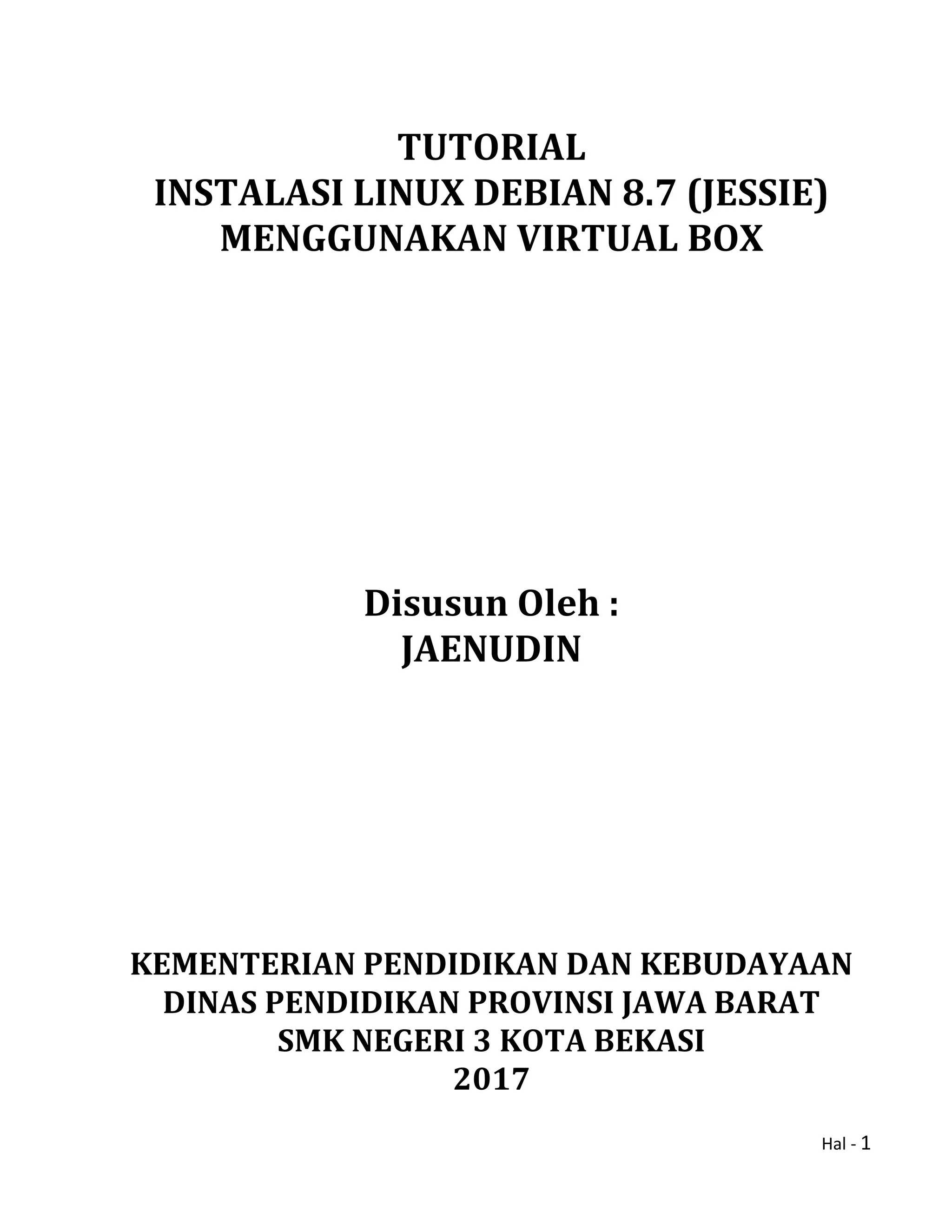 Dokumen ini adalah tutorial instalasi Linux Debian 8.7 (Jessie) menggunakan VirtualBox dan mencakup langkah-langkah detail dari pengantar Debian hingga konfigurasi berbagai server seperti DHCP dan DNS. Penjelasan mencakup sejarah rilis Debian dan cara menginstal serta mengkonfigurasi aplikasi yang diperlukan. Tutorial ini adalah panduan lengkap untuk pengguna yang ingin menginstal dan mengkonfigurasi Debian di lingkungan virtual.