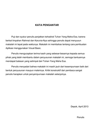 Dokumen ini adalah tutorial mengenai pembuatan aplikasi menggunakan Visual Basic 6.0 di SMK Negeri 1 Depok, yang disusun oleh Novega Eldiarwan. Tutorial mencakup langkah-langkah instalasi software, pembuatan form, serta pengkodean untuk aplikasi 'keterangan murid' yang terhubung dengan database Microsoft Access. Penulis juga mengharapkan kritik konstruktif dari pembaca untuk penyempurnaan makalah di masa depan.