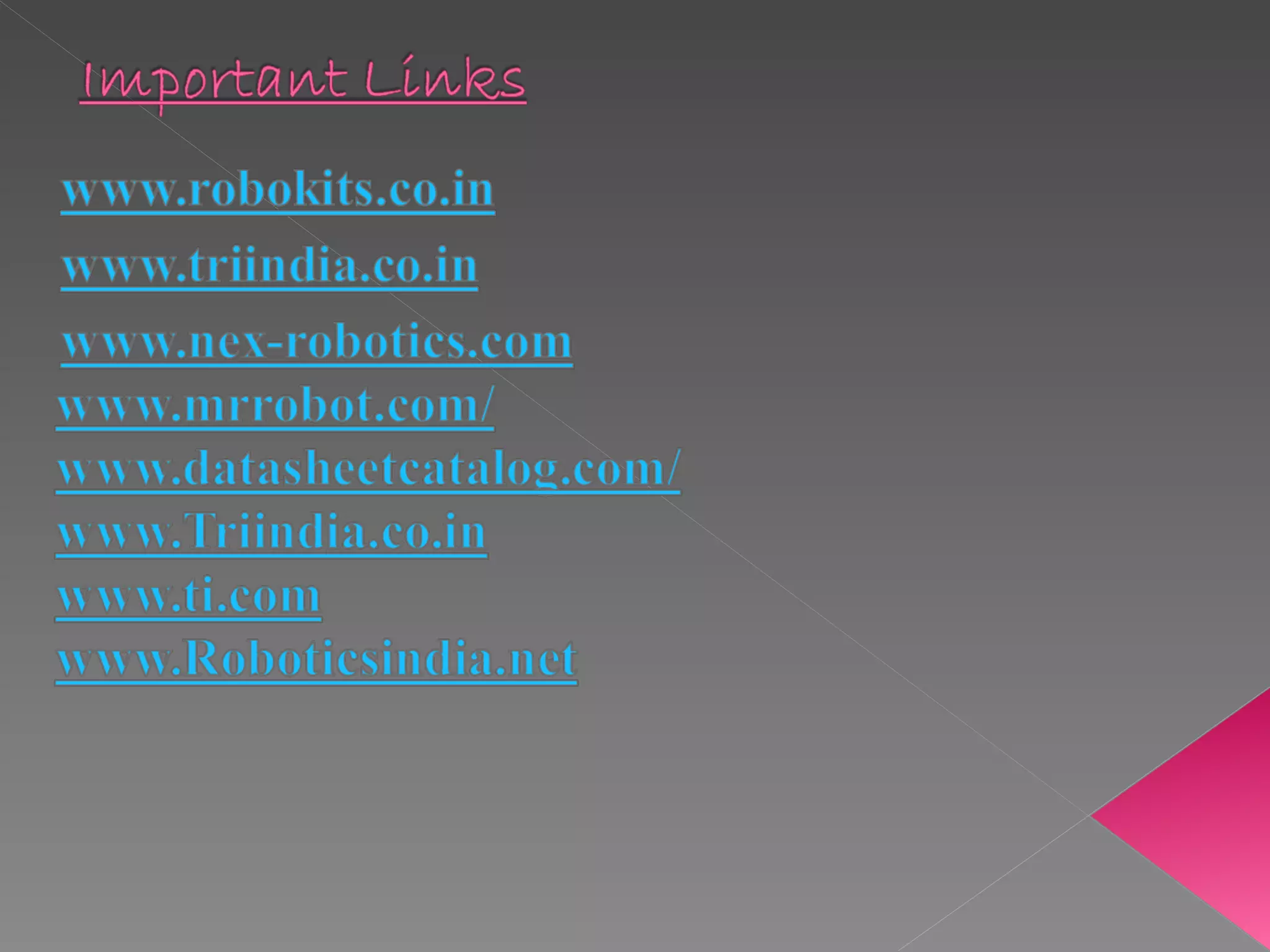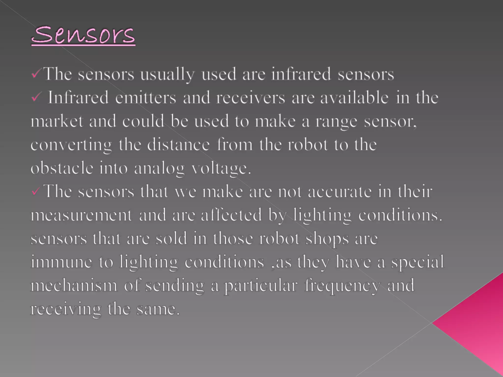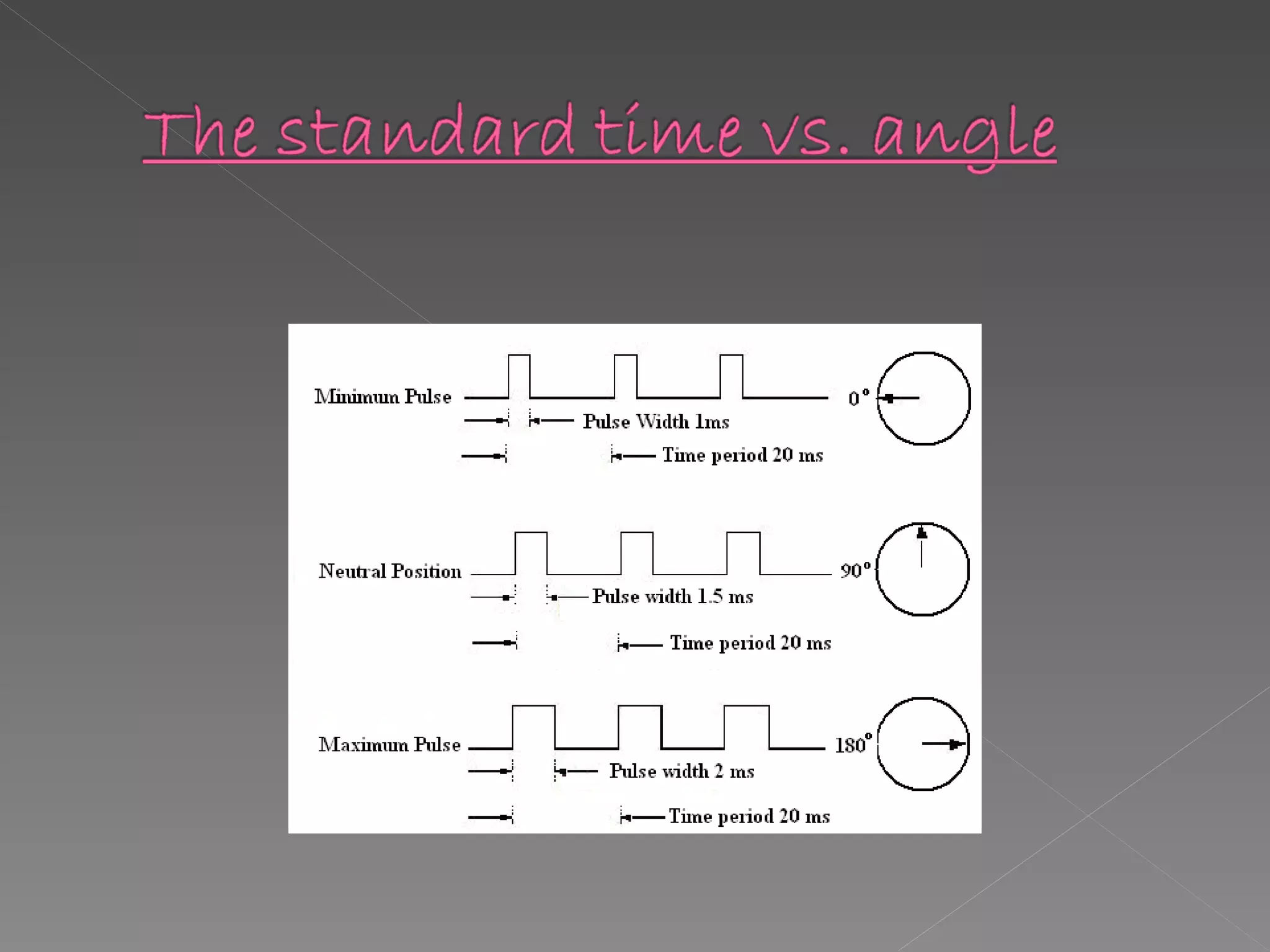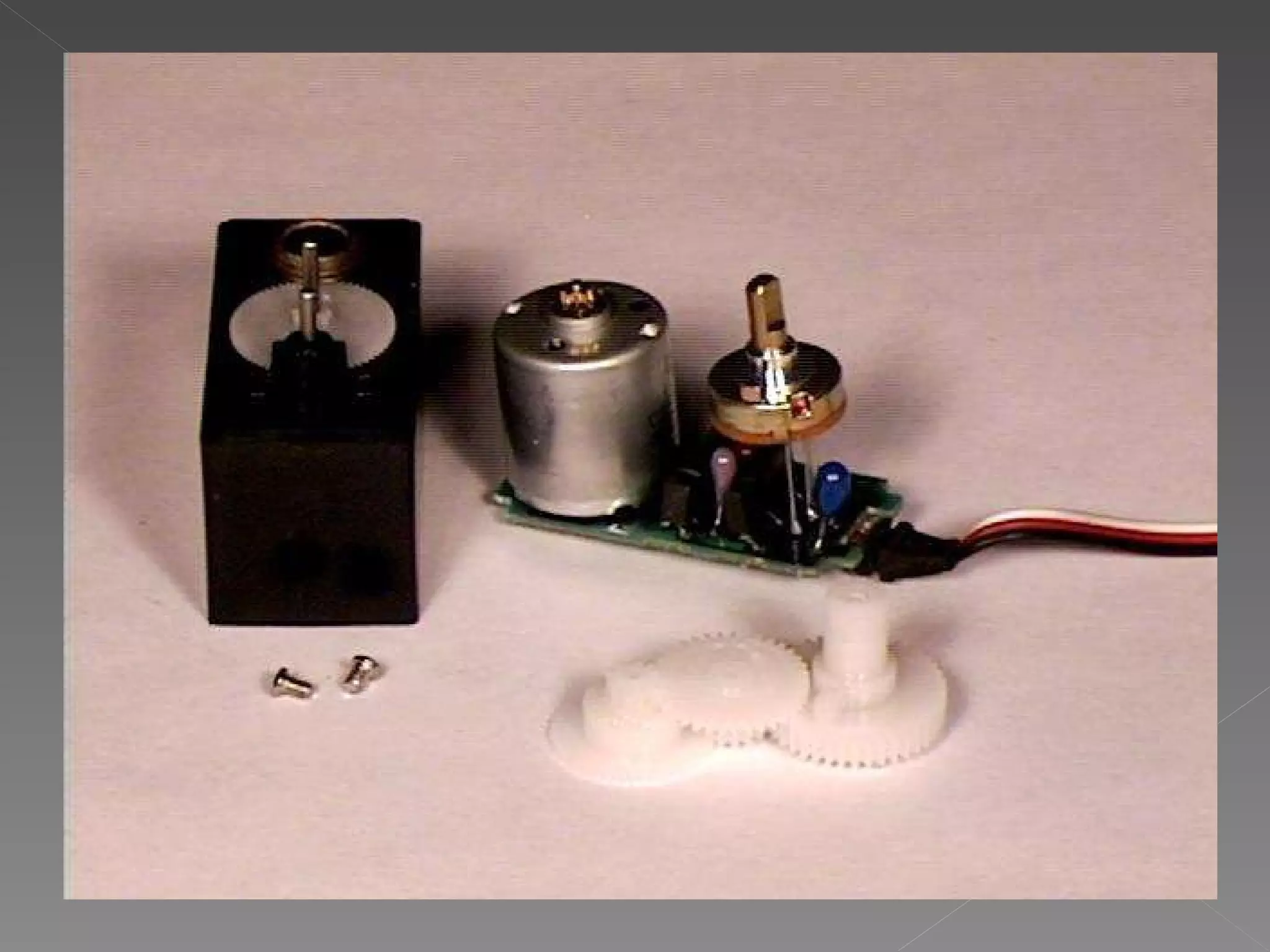 Servos are DC motors with built-in gearing and feedback control that can be positioned by pulsed signals to the control wire. They operate from 4.8-6V and have power, ground, and signal wires. The pulse width controls the position, with 1.5ms at the center and shorter or longer pulses to either side. Microcontrollers are integrated circuits that contain a CPU, memory, and I/O to control an embedded system with a dedicated function through simple, repeating instructions stored in ROM.
