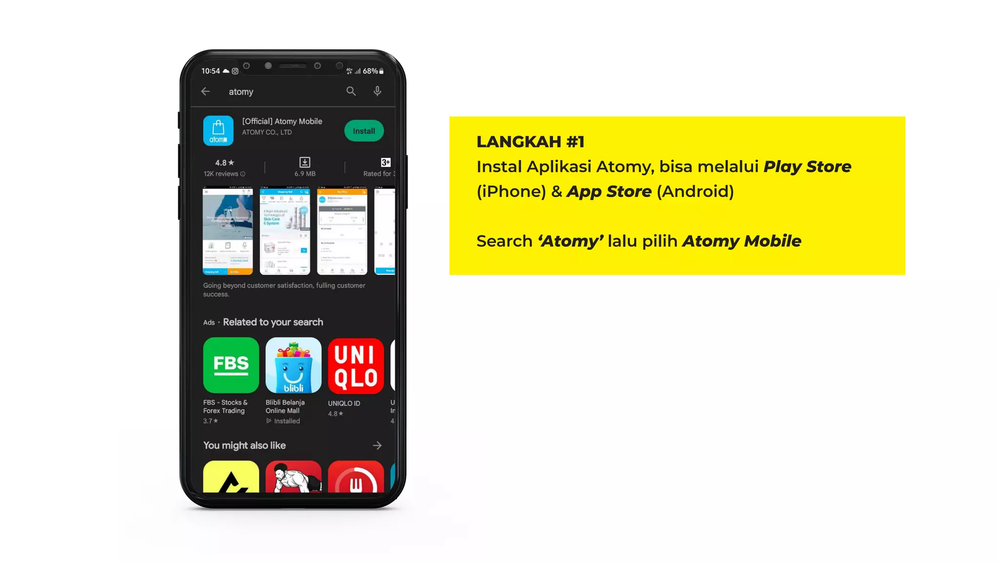 Dokumen ini adalah panduan langkah demi langkah untuk menginstal dan menggunakan aplikasi Atomy. Pengguna diinstruksikan untuk login dan mengatur harga dalam rupiah sebelum melanjutkan ke proses pembelian barang. Juga terdapat informasi tentang pembayaran dan pengiriman barang.