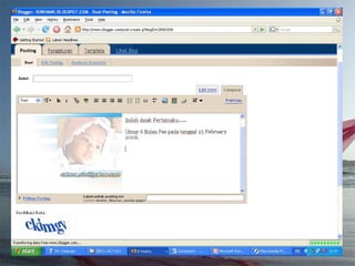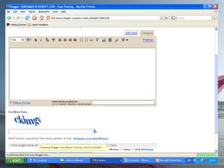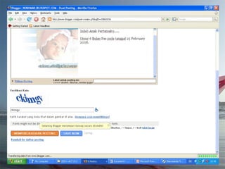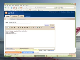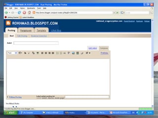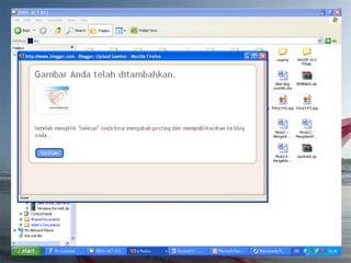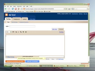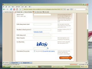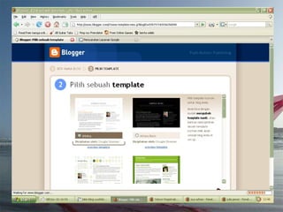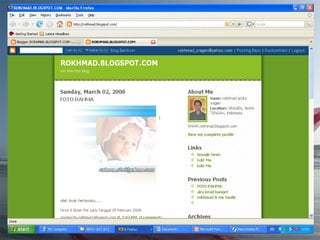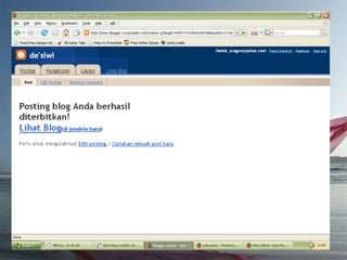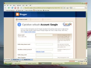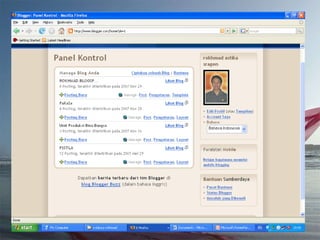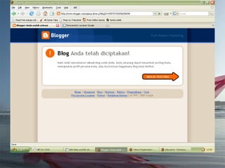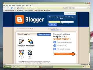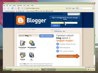 Dokumen ini adalah tutorial tentang cara membuat blog, yang merupakan catatan pribadi di internet yang sering diperbarui dan dapat dibaca oleh publik. Blog biasanya mengandung informasi chronologis, mencakup berbagai topik, serta memungkinkan pembaca untuk memberikan komentar. Selain itu, penulis blog (blogger) dapat mengekspresikan diri dan memilih untuk membuat blog gratis atau berbayar.