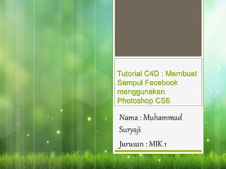 Dokumen ini adalah tutorial untuk membuat sampul Facebook menggunakan Photoshop CS6 dengan langkah-langkah yang terperinci. Pengguna diajarkan cara menyiapkan bahan mentah, mengatur ukuran gambar, dan menambahkan elemen hingga kreasikan tampilan akhir. Proses mencakup penggunaan berbagai alat di Photoshop untuk mencapai hasil yang diinginkan.
