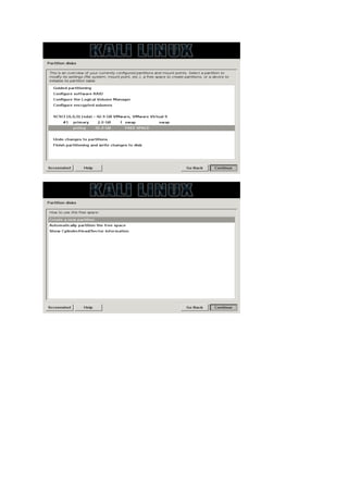 Dokumen ini adalah tutorial langkah demi langkah untuk menginstal Kali Linux menggunakan media installer seperti CD atau USB bootable. Proses mencakup pengaturan BIOS, memilih opsi boot, dan melakukan partisi hard disk, serta pengaturan lainnya sebelum menyelesaikan instalasi. Setelah proses instalasi selesai, pengguna diinstruksikan untuk merestart perangkat untuk mencoba hasil instalasinya.