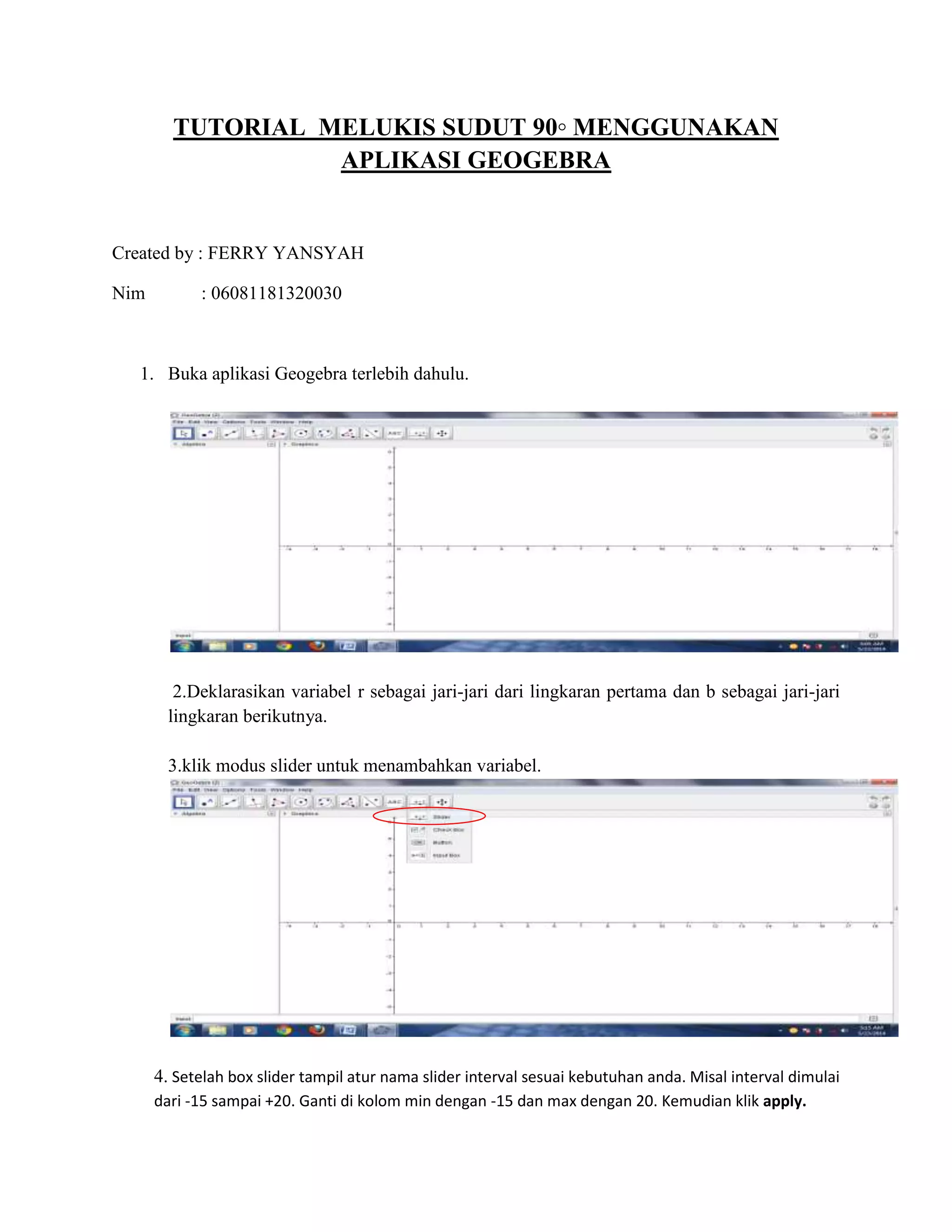 Dokumen ini adalah tutorial untuk melukis sudut 90° menggunakan aplikasi GeoGebra. Langkah-langkah mencakup pengaturan variabel, penggunaan slider, dan pembuatan lingkaran serta garis untuk menentukan sudut. Tutorial ini menjelaskan proses secara rinci dengan langkah yang jelas dari awal hingga akhir.