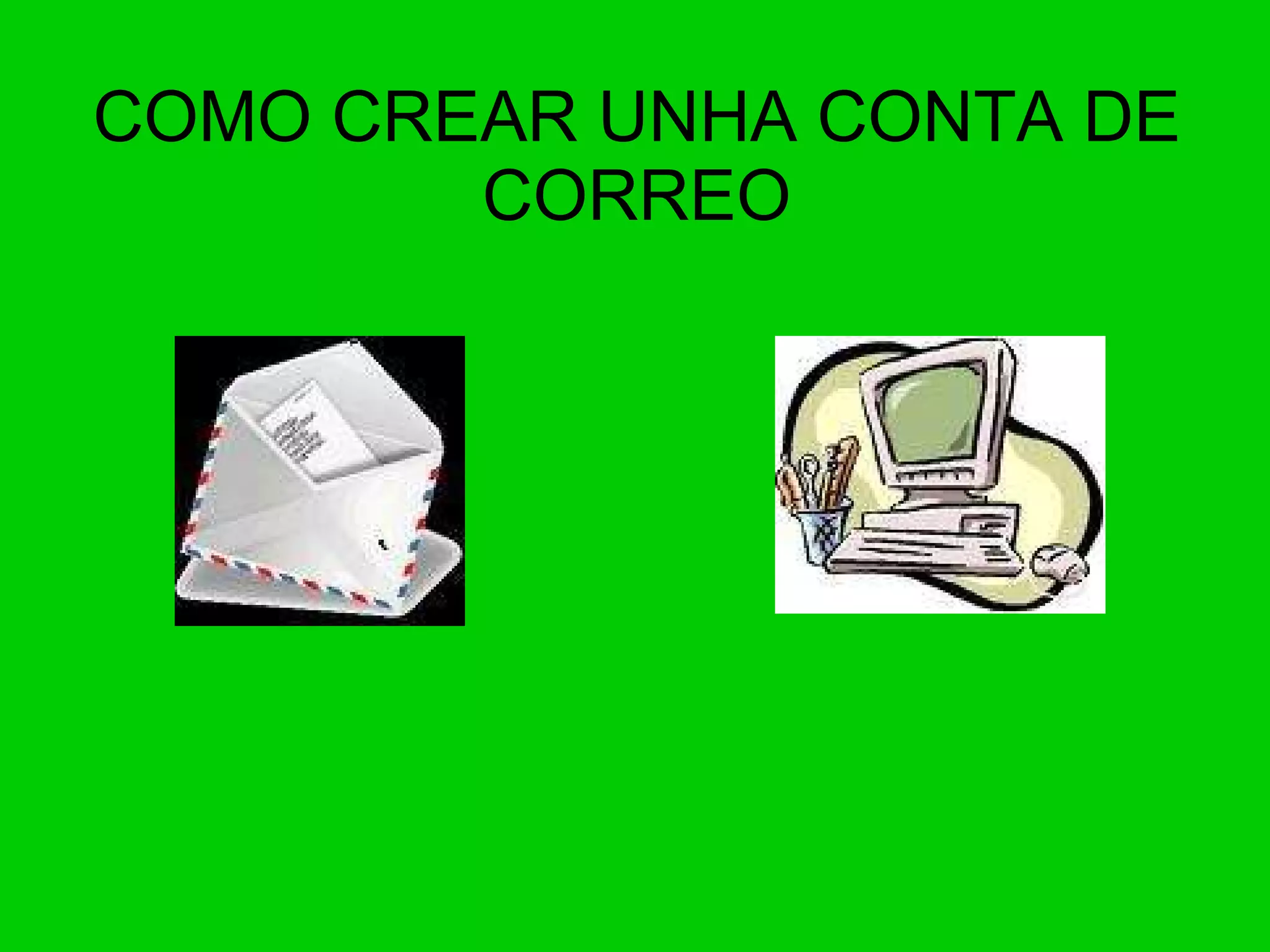 Debes cubrir todosos datos que te pide, non teñen porque ser os de verdade, podemos inventar un nome. 1. Fixarse no nome do rexistro , hai que comprobar a disponibilidade, si ese nome que ti elixes xa está collido debes buscar outro. 2. Elixe unha contraseña fácil de recordar, vala ter que escribir sempre que queiras entrar no teu correo, non lla des a ninguén 3. Verificación de la palabra , tes que repetir, escribindo, unha palabra un pouco rara que aparece escrita. 4. Xa por último acepto crear miña cuenta. 5. Se fixeches todo ben, xa tes un correo electrónico, se non é así volve a repetir o proceso.