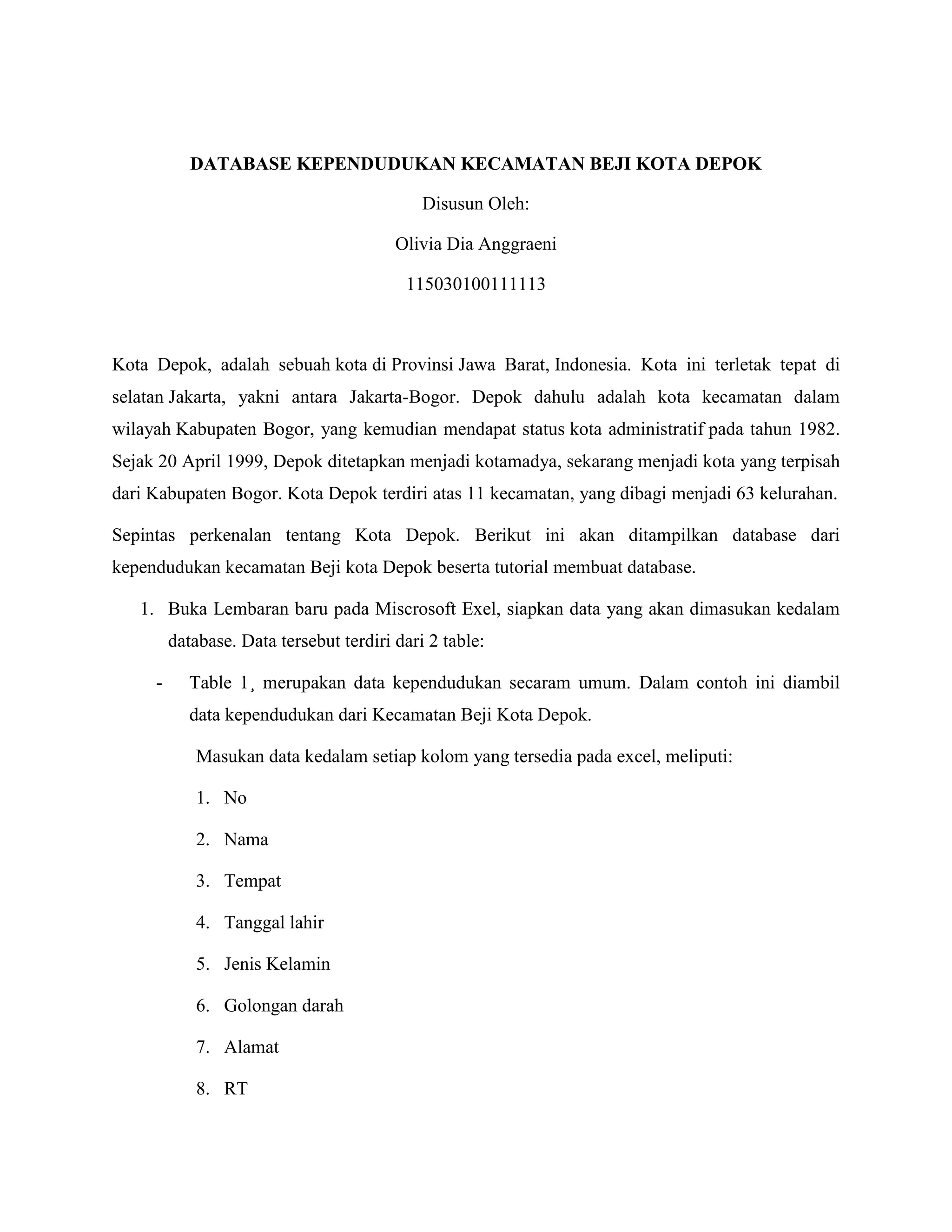 Dokumen ini menjelaskan tentang penyusunan database kependudukan untuk Kecamatan Beji, Kota Depok, yang mencakup prosedur pembuatan database menggunakan Microsoft Excel dan Microsoft Access. Terdapat dua tabel data: satu tabel untuk data umum kependudukan dan tabel tambahan untuk informasi pendukung. Proses mencakup pengisian data, pembuatan form, dan query design untuk menggabungkan data utama dengan data pendukung.
