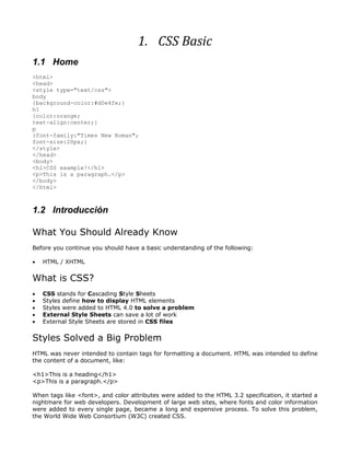This document is a comprehensive tutorial on CSS (Cascading Style Sheets), covering its purpose in formatting HTML elements and providing guidelines on syntax, selectors, and style application methods. It explains background properties, text formatting, and various ways to insert CSS into HTML documents, highlighting the cascading nature of CSS where multiple styles can interact. The tutorial emphasizes best practices in applying styles, such as using external style sheets for efficiency and clarity.