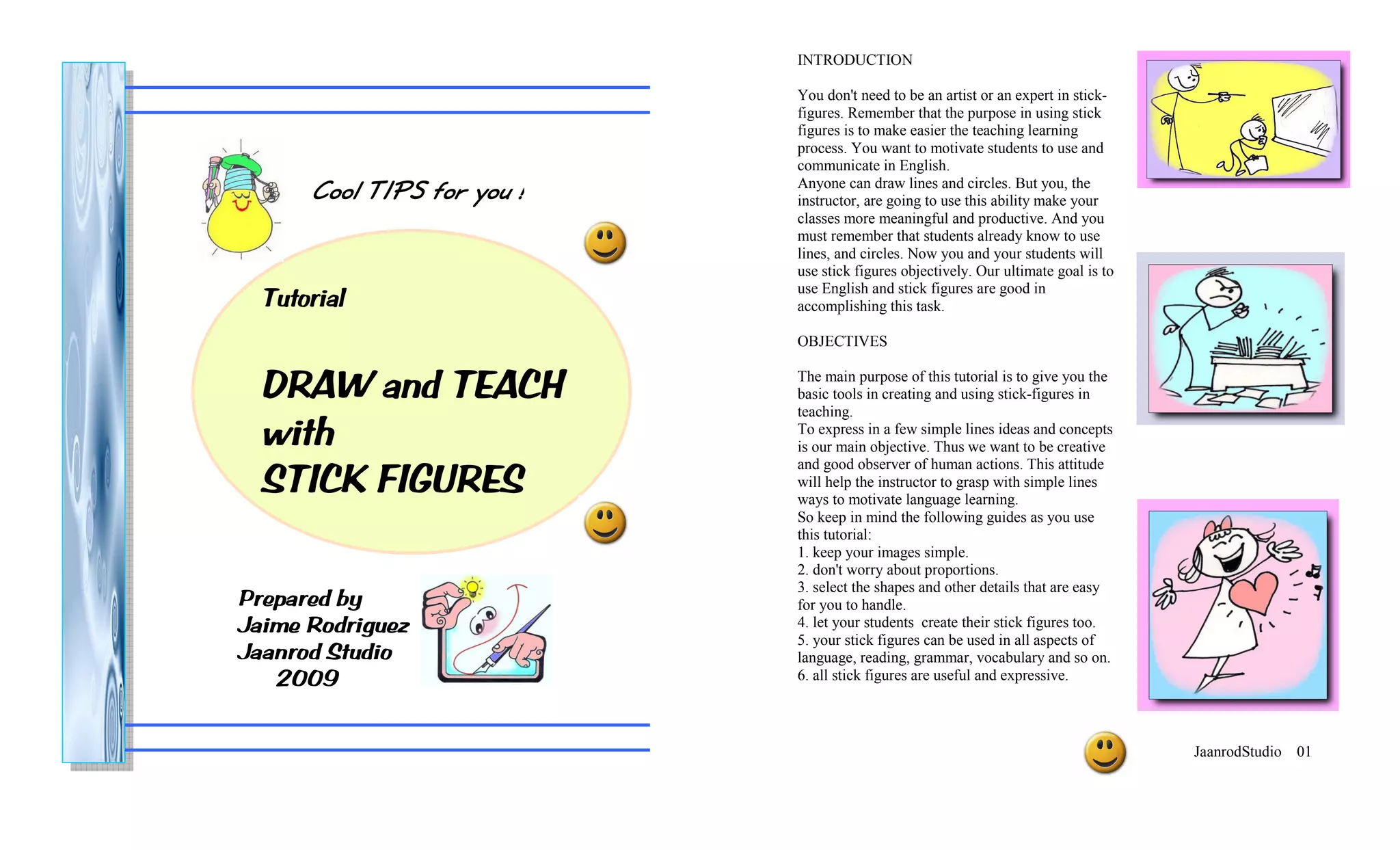 This tutorial aims to provide educators with steps to effectively use stick figures in teaching English, emphasizing simplicity and creativity. It outlines objectives like drawing stick figures, incorporating them into didactic materials, and using them in language activities. Additionally, it encourages instructors to let students engage in creating their own stick figures to enhance the learning experience.