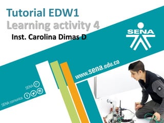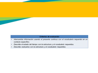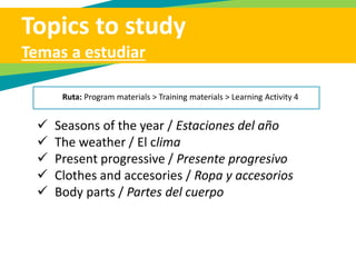 This document provides an overview of Learning Activity 4 from the English Dot Works Beginner tutorial. It includes topics like seasons, weather, clothing, body parts, and the present progressive tense. It outlines examples and exercises for students to complete as evidence for different topics. These include describing street scenes, recognizing body parts, describing weather, and consolidating the lessons through daily routine and vacation descriptions. It concludes with a required program evaluation survey.