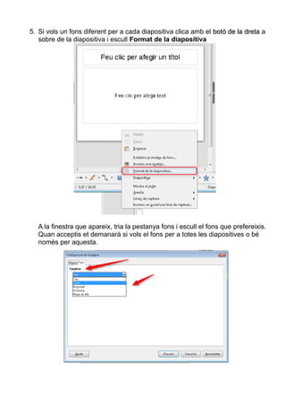 5. Si volsun fons diferent per a cada diapositiva clica amb el botó de la dretabotó de la dreta a