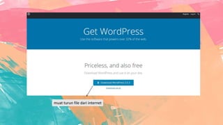 Tutoria ini menjelaskan langkah-langkah untuk menginstalasi WordPress secara lokal menggunakan XAMPP/WAMPP. Langkah-langkahnya meliputi mengunduh dan mengekstrak file WordPress, membuat database baru di phpMyAdmin, menghubungkan WordPress dengan database, dan menjalankan proses instalasi untuk membuat situs WordPress lokal.