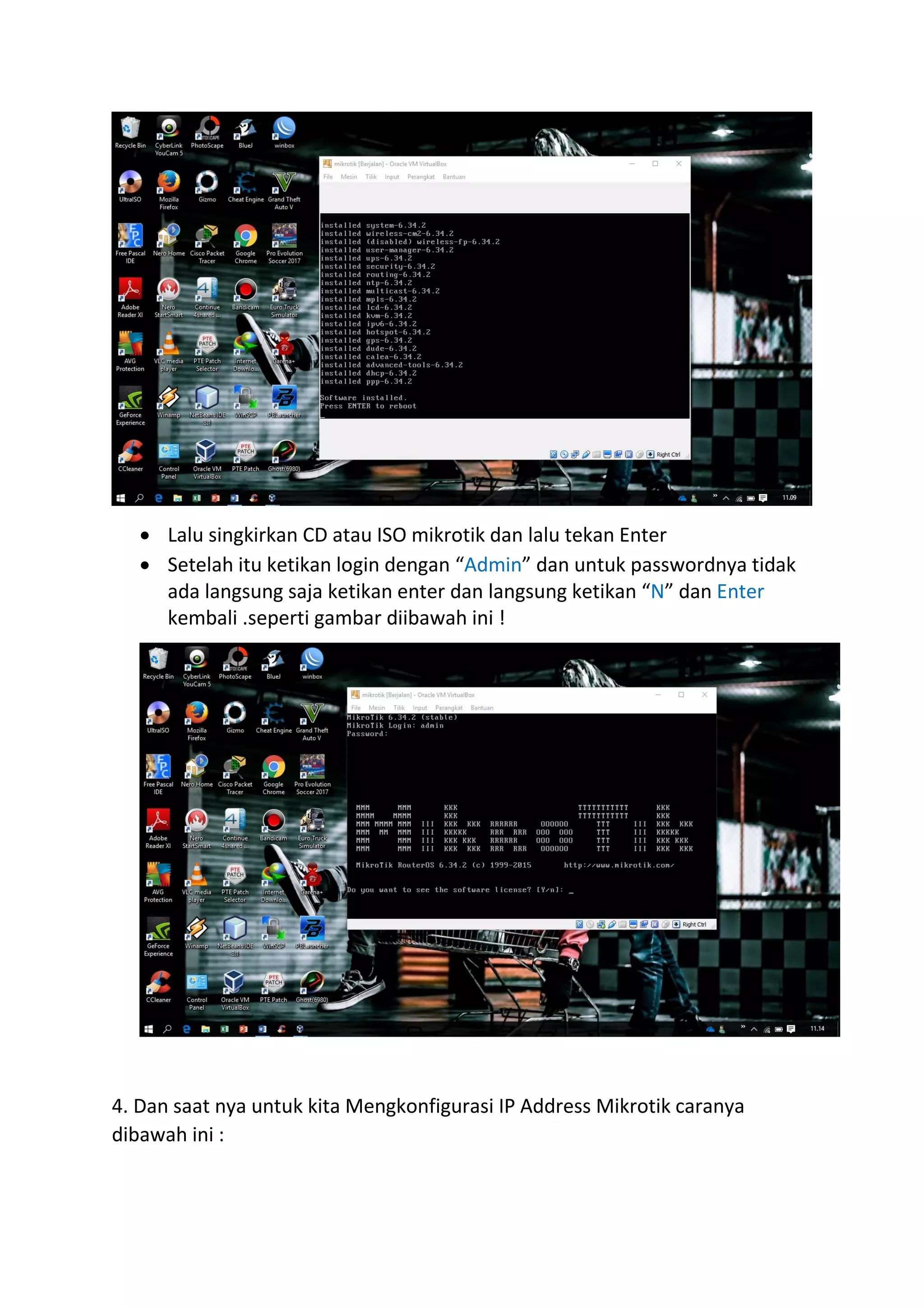 Dokumen ini adalah tutorial mengenai cara menginstal hotspot Mikrotik menggunakan VirtualBox. Langkah-langkah mencakup persiapan bahan, instalasi Mikrotik, konfigurasi IP address, dan pengaturan hotspot menggunakan Winbox. Setelah selesai, pengguna dapat mengakses halaman hotspot dengan DNS yang telah disetting.