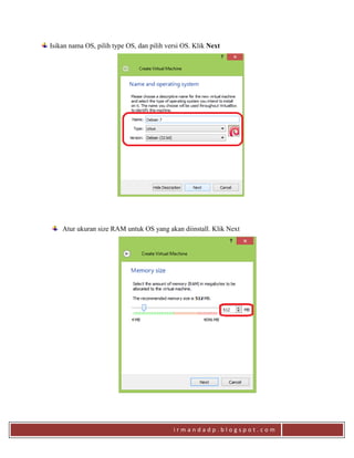 Tutorial ini menjelaskan langkah-langkah instalasi Debian Server 7.2 Wheezy secara virtual menggunakan Oracle VM VirtualBox, meliputi konfigurasi partisi harddisk, pemilihan komponen sistem operasi, dan pengaturan jaringan.