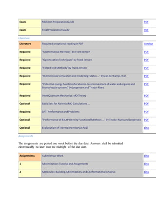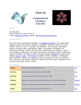 This document provides information about the Computational Chemistry 126 course offered at UC Santa Barbara in Fall 2011, including the instructor's contact information, course objectives, required readings and assignments. The course focuses on learning principles of computational chemistry and molecular modeling techniques. Students will learn algorithms for geometry optimization, transition state location, and prediction of molecular properties using software for quantum chemical calculations and molecular simulations.