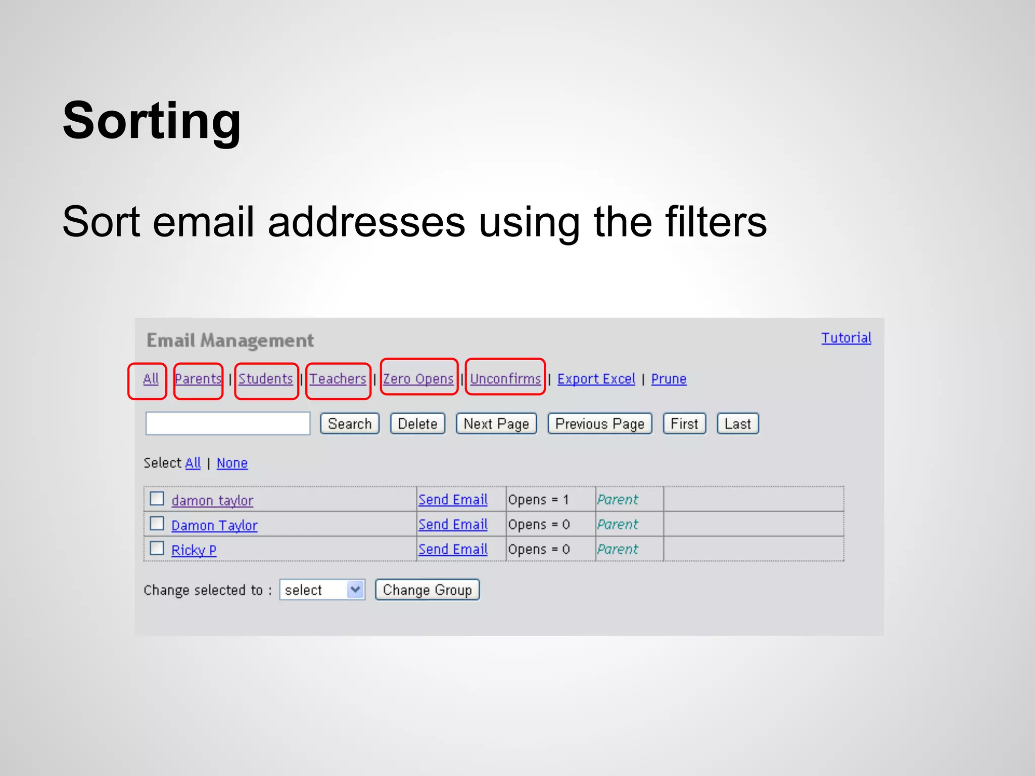 The document outlines the management of school email addresses since 2009, detailing features such as sorting, synchronizing, and exporting parent email information to Excel. It explains how to delete inactive email addresses and update parent lists by selecting individual names. Users can also send direct emails and change group affiliations for parents within the system.