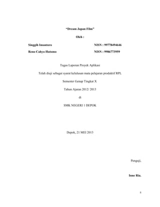 Dokumen ini adalah laporan proyek dari aplikasi web bernama 'Dream Japan Film' yang dibuat oleh Singgih Imantoro dan Reno Cahyo Hutomo sebagai syarat kelulusan. Website ini bertujuan untuk menyediakan berbagai macam film Jepang dan anime, dengan fitur seperti download dan alur cerita. Penulis berharap aplikasi ini dapat menjadi sumber utama film Jepang di Indonesia dan terbuka untuk kritik serta saran dari pengunjung.