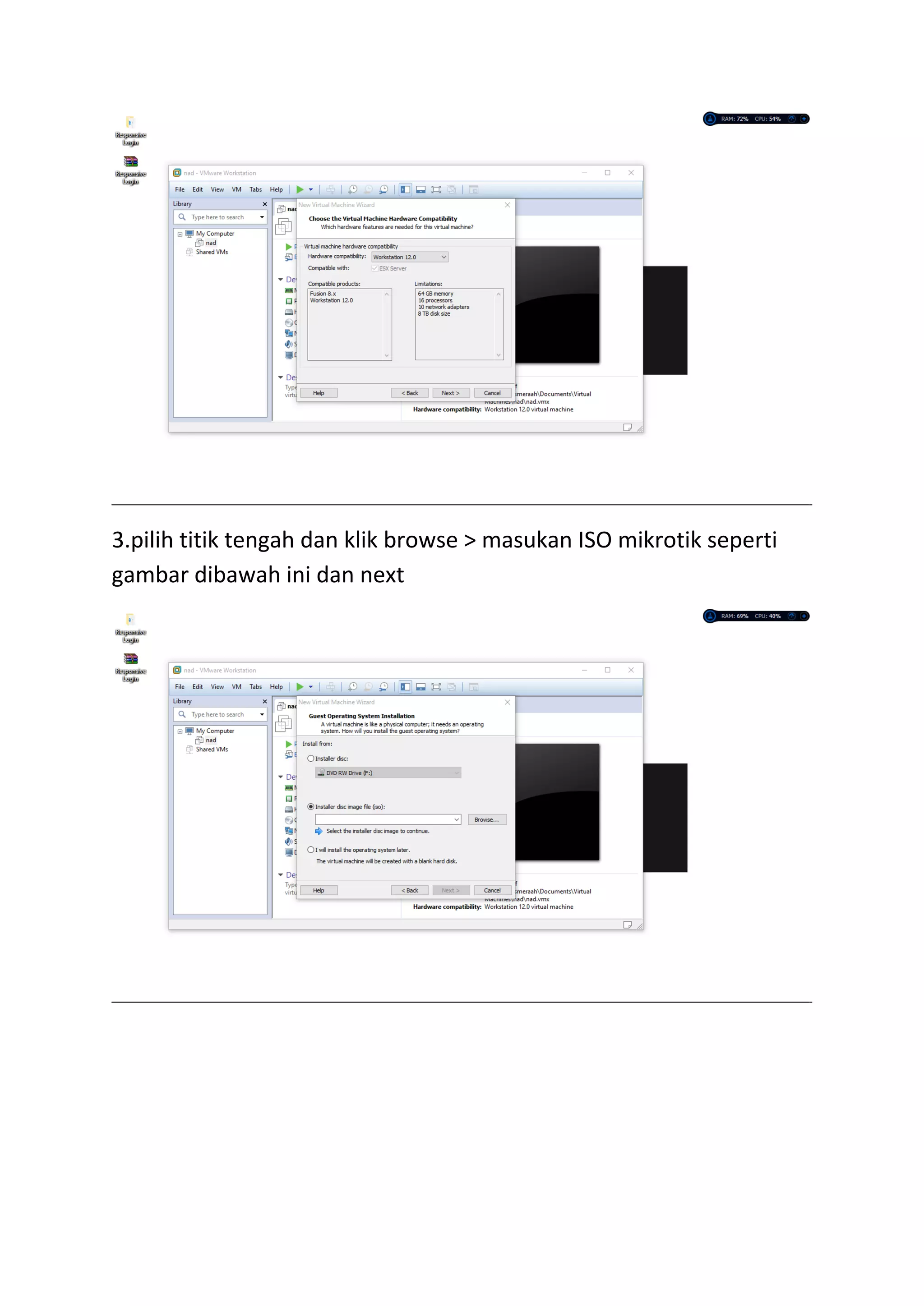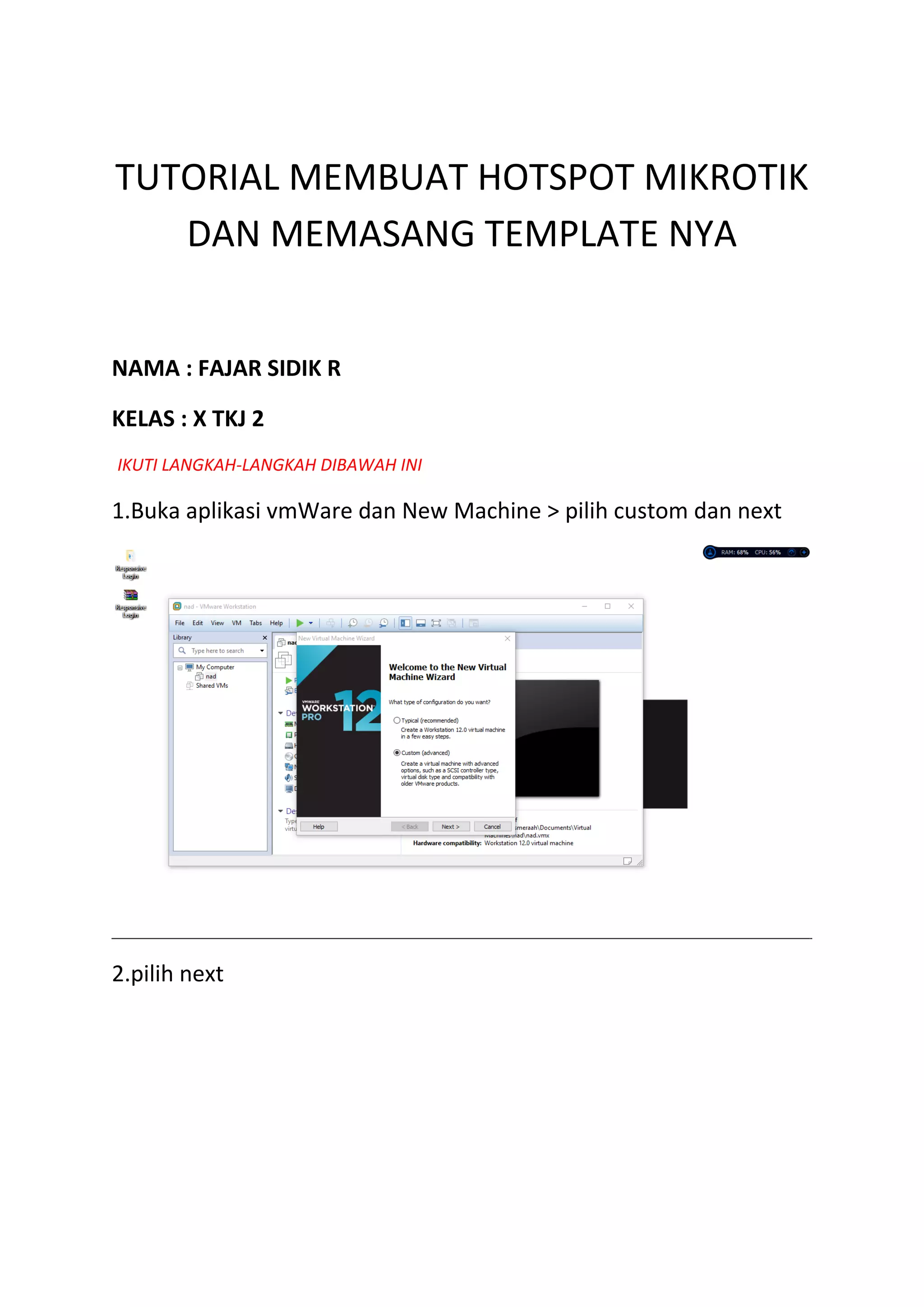 Tutorial ini menjelaskan langkah-langkah untuk membuat hotspot MikroTik dan memasang template, meliputi penginstalan MikroTik pada vmWare, pengaturan alamat IP dan konfigurasi hotspot, penambahan template login melalui Winbox, dan pengeditan template menggunakan aplikasi Sublime.