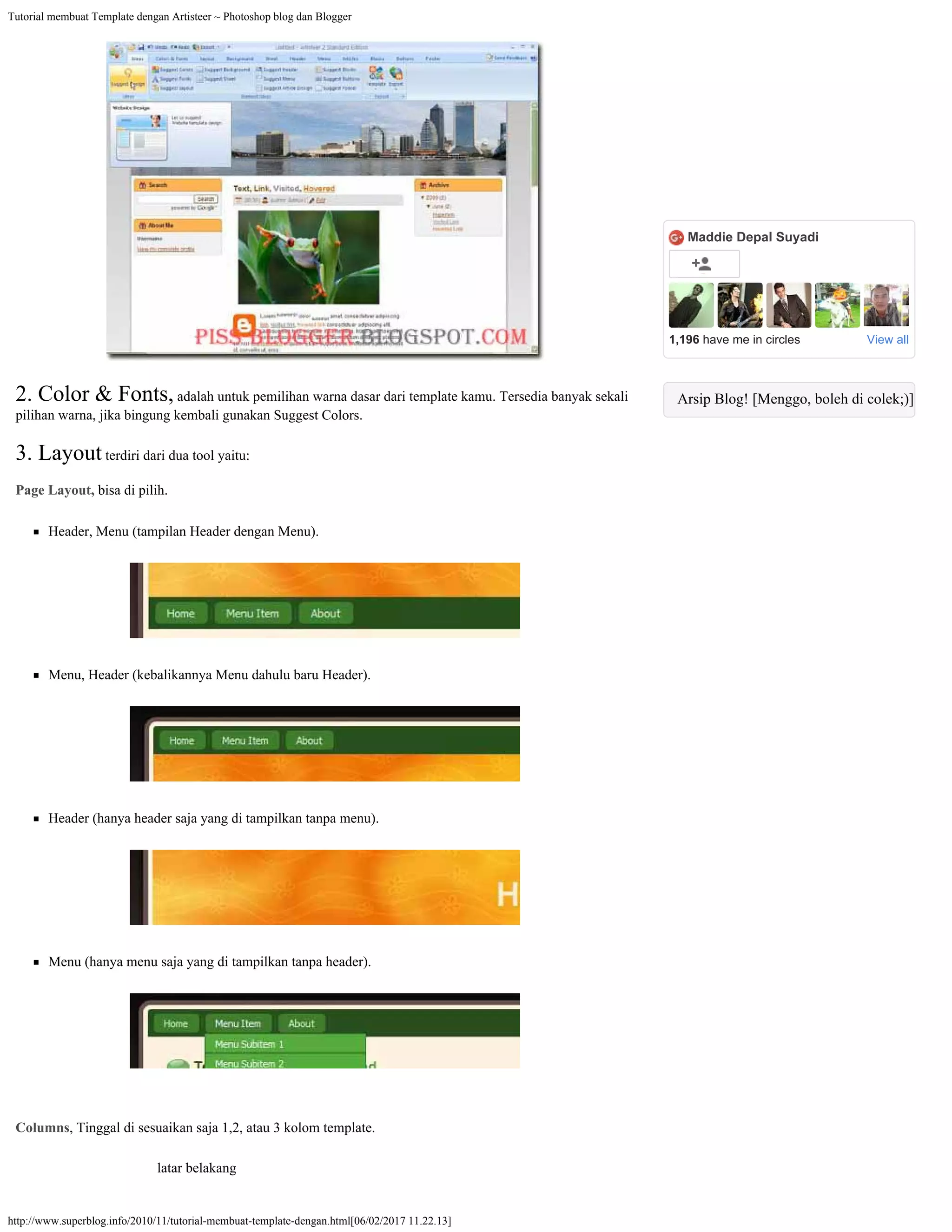Tutorial membuat Templatedengan Artisteer ~ Photoshop blog dan Blogger http://www.superblog.info/2010/11/tutorial-membuat-template-dengan.html[06/02/2017 11.22.13] Maddie Depal Suyadi 1,196 have me in circles View all Arsip Blog! [Menggo, boleh di colek;)]2. Color & Fonts, adalah untuk pemilihan warna dasar dari template kamu. Tersedia banyak sekali pilihan warna, jika bingung kembali gunakan Suggest Colors. 3. Layout terdiri dari dua tool yaitu: Page Layout, bisa di pilih. Header, Menu (tampilan Header dengan Menu). Menu, Header (kebalikannya Menu dahulu baru Header). Header (hanya header saja yang di tampilkan tanpa menu). Menu (hanya menu saja yang di tampilkan tanpa header). Columns, Tinggal di sesuaikan saja 1,2, atau 3 kolom template. latar belakang Arsip Blog! [Menggo, boleh di colek;)]