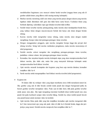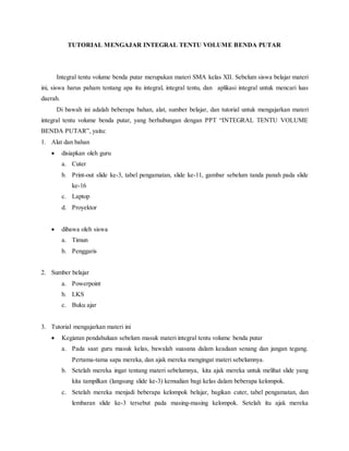 Tutoria mengajarkan integral tentu volume benda putar dengan menggunakan timun sebagai benda putar, dimana siswa akan memotong timun menjadi tabung lalu mengukur volume tabung tersebut. Siswa dibagi kelompok untuk berdiskusi dan mengerjakan soal-soal integral volume benda putar sebelum, selama, dan sesudah pembelajaran menggunakan video dan slide penjelasan.
