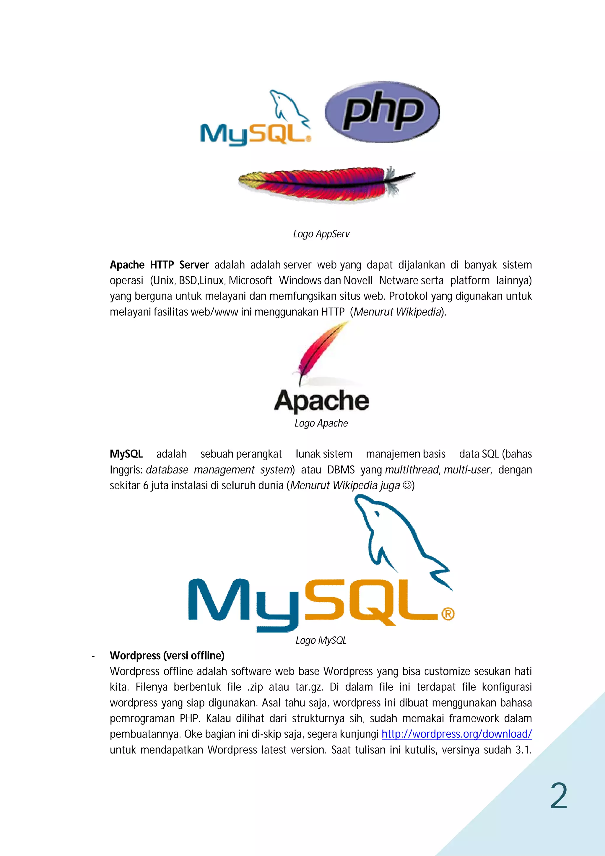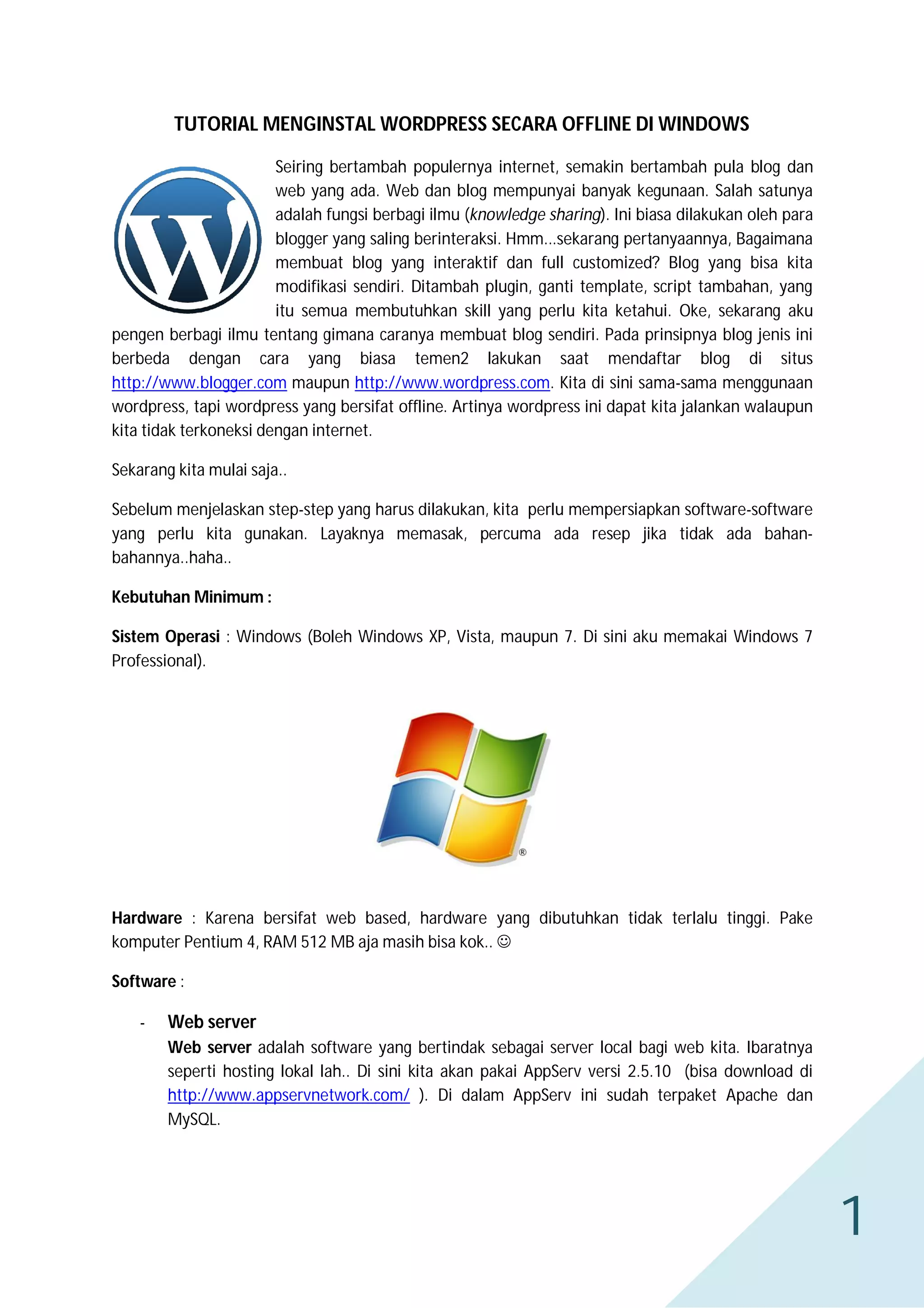 Teks ini memberikan tutorial lengkap untuk menginstal WordPress secara offline di Windows dengan menggunakan AppServ sebagai web server lokal dan MySQL sebagai databasenya. Langkah-langkahnya meliputi persiapan perangkat lunak yang dibutuhkan, instalasi AppServ dan database, ekstrak file WordPress, konfigurasi database pada WordPress, dan pengisian identitas blog.