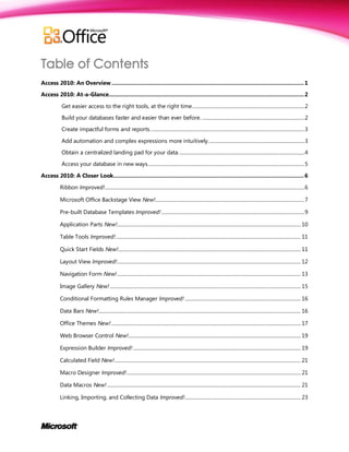 This document provides an overview of the new features in Microsoft Access 2010. It highlights improvements to the ribbon interface, backstage view, database templates, tables, forms, reports, expressions and more. New features include application parts, navigation forms, image galleries, web browser controls, calculated fields, data macros and web databases. Access 2010 aims to simplify database building and make powerful tools accessible even to non-experts, enabling users to better organize, analyze and share their data.