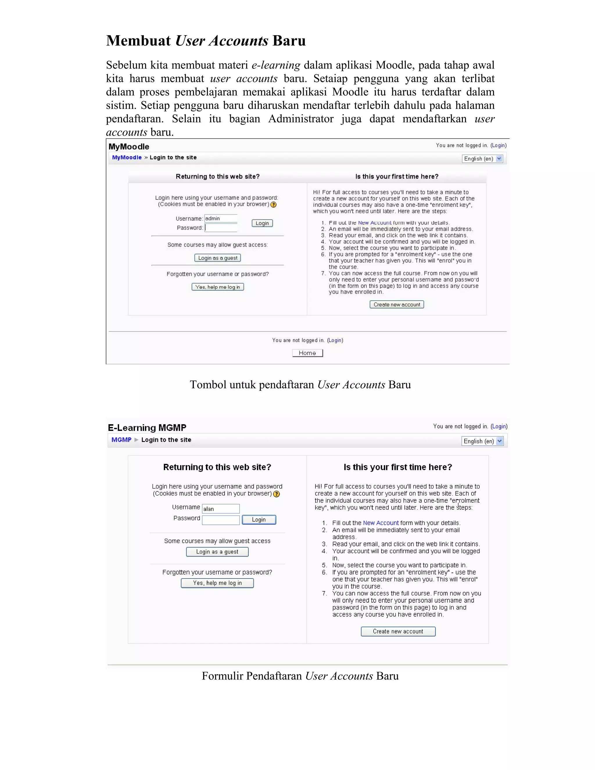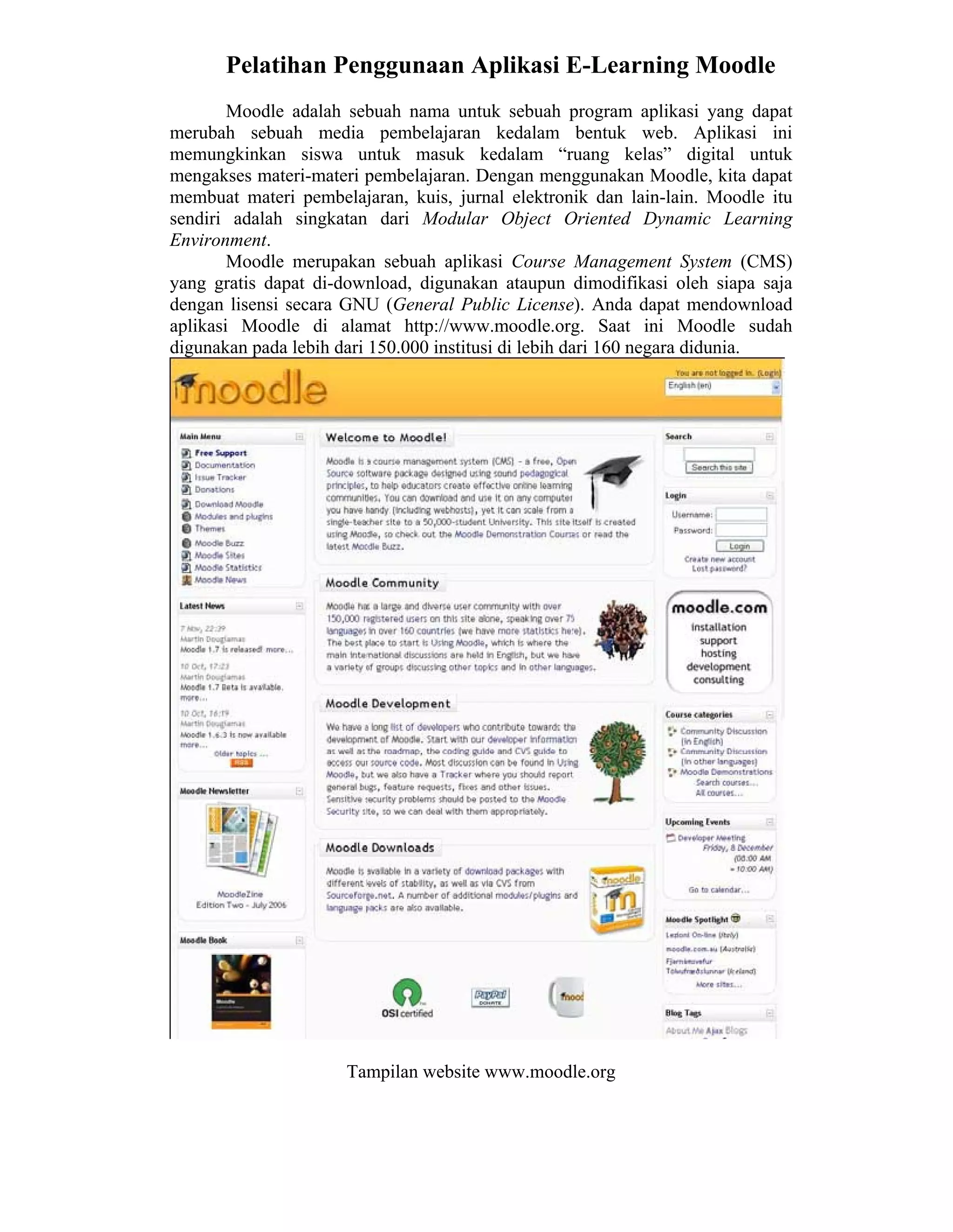 Dokumen ini membahas pelatihan penggunaan aplikasi e-learning Moodle, yang memungkinkan pengguna untuk mengubah media pembelajaran ke dalam format web. Moodle mendukung berbagai fitur seperti pembuatan materi, kuis, dan forum diskusi, dan sudah digunakan di banyak institusi di seluruh dunia. Proses penggunaan melibatkan pendaftaran pengguna dan pengelompokan materi pembelajaran dalam kategori yang terstruktur.