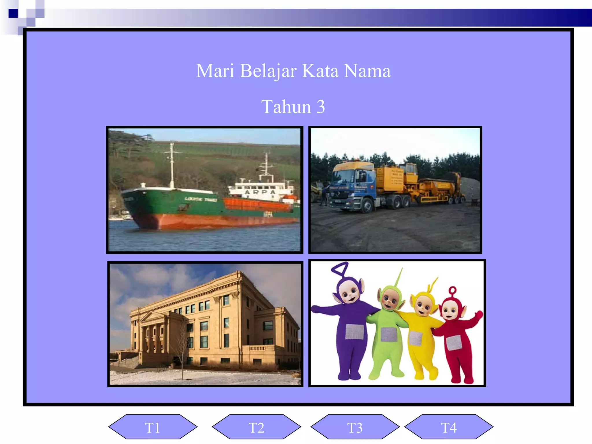 Dokumen ini mengandungi pelajaran tentang kata nama am, kata nama khas, kata ganti nama, dan kata nama terbitan. Setiap tajuk menerangkan ciri-ciri kata nama, cara penggunaannya, dan menyediakan contoh serta aktiviti untuk membantu pemahaman. Terdapat juga penilaian untuk mengukur kefahaman pelajar mengenai konsep yang dipelajari.