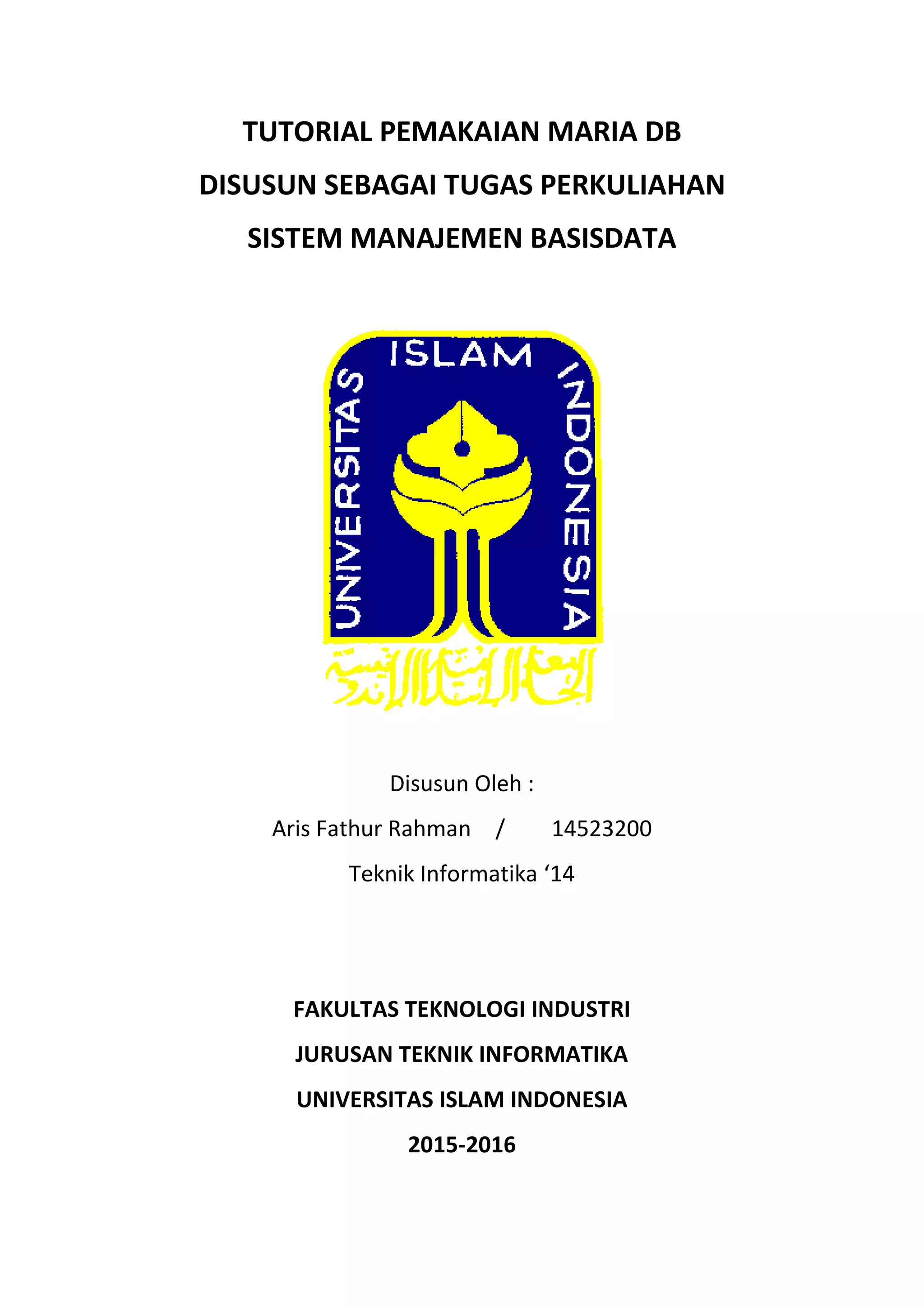 Dokumen ini adalah tutorial pemakaian MariaDB yang mencakup instalasi dan konfigurasi awal menggunakan HeidiSQL. Selain itu, dijelaskan juga tentang perintah DDL dan DML untuk mengelola dan memanipulasi data dalam basisdata. Contoh perintah termasuk membuat database, menambah, memperbarui, dan menghapus data dalam tabel.