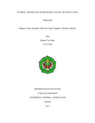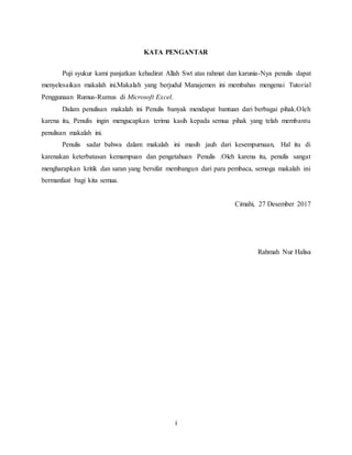 Makalah ini membahas tutorial penggunaan rumus-rumus dan fungsi-fungsi dalam Microsoft Excel seperti rumus matematika (SUM, AVERAGE, MAX, MIN), logika (IF, AND, OR), pencarian data (VLOOKUP, HLOOKUP), dropdown list, name manager, dan conditional formatting.