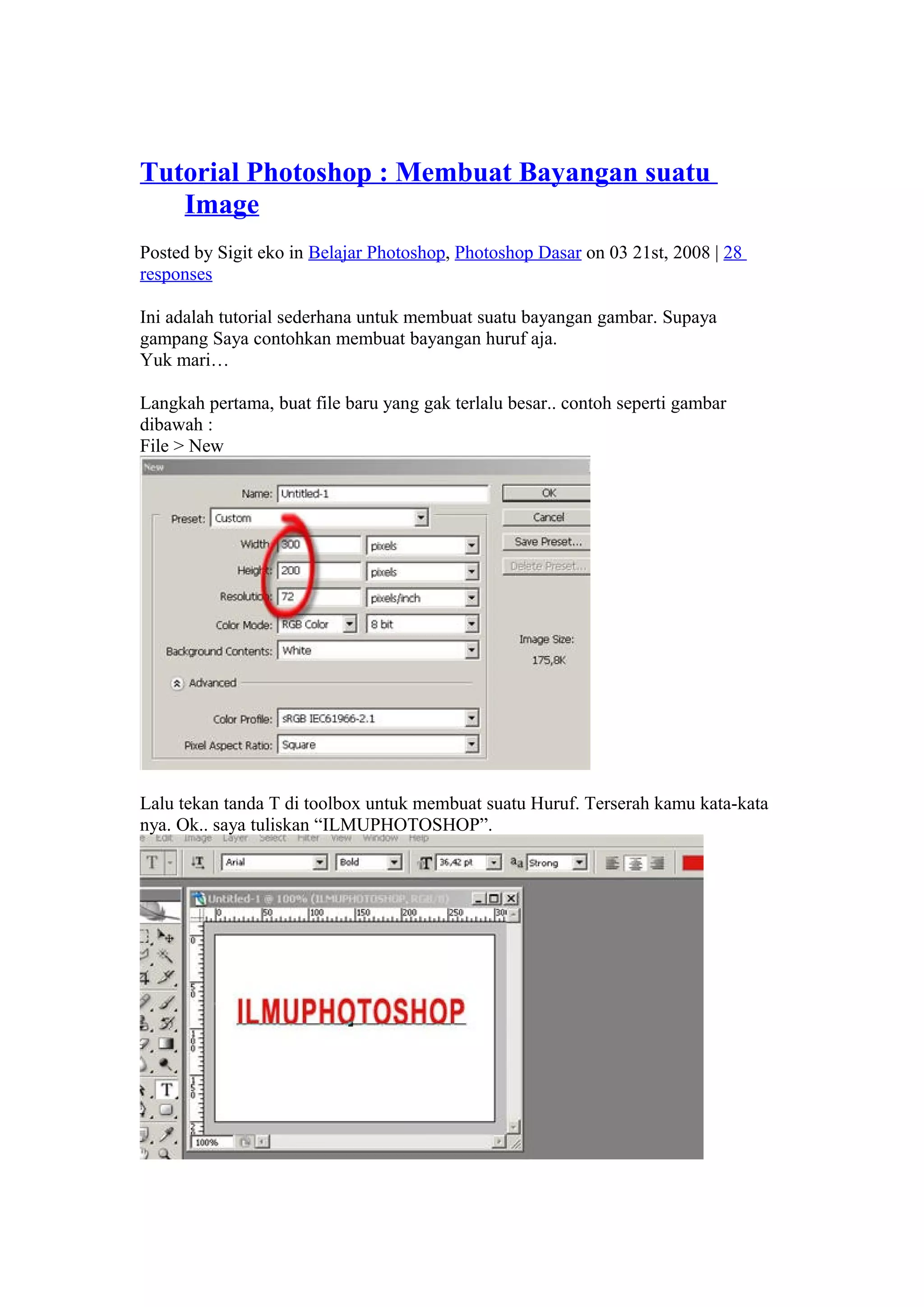 Tutoria menjelaskan langkah-langkah sederhana untuk membuat bayangan gambar di Photoshop. Pertama, buat file baru dan tuliskan teks. Kemudian buat duplikat layer teks dan ubah orientasinya. Geser duplikat tersebut untuk membentuk bayangan. Terakhir, gunakan alat gradient untuk membuat gradasi warna pada bayangan. Tutorial ini memberikan instruksi visual yang jelas untuk membuat efek bayangan sederhana.