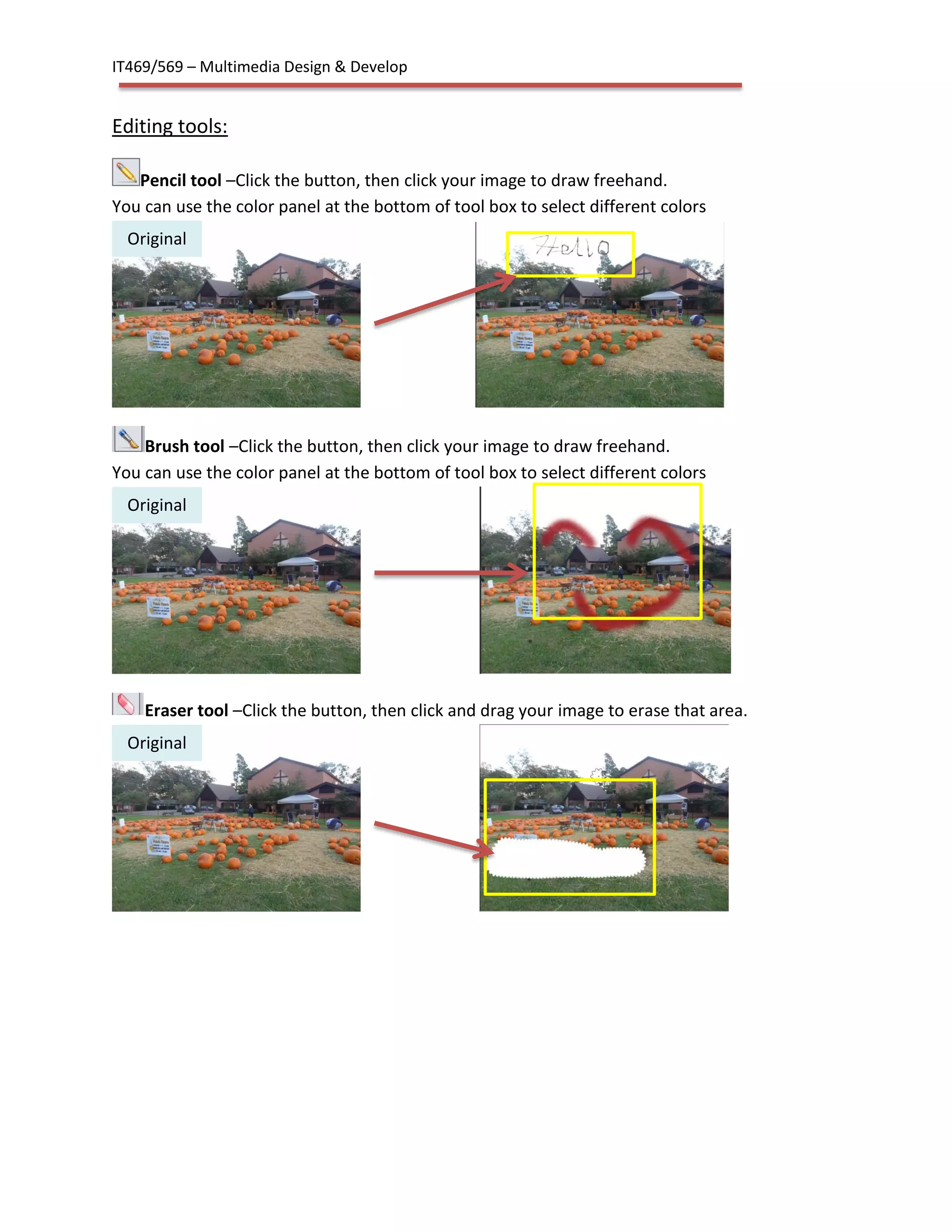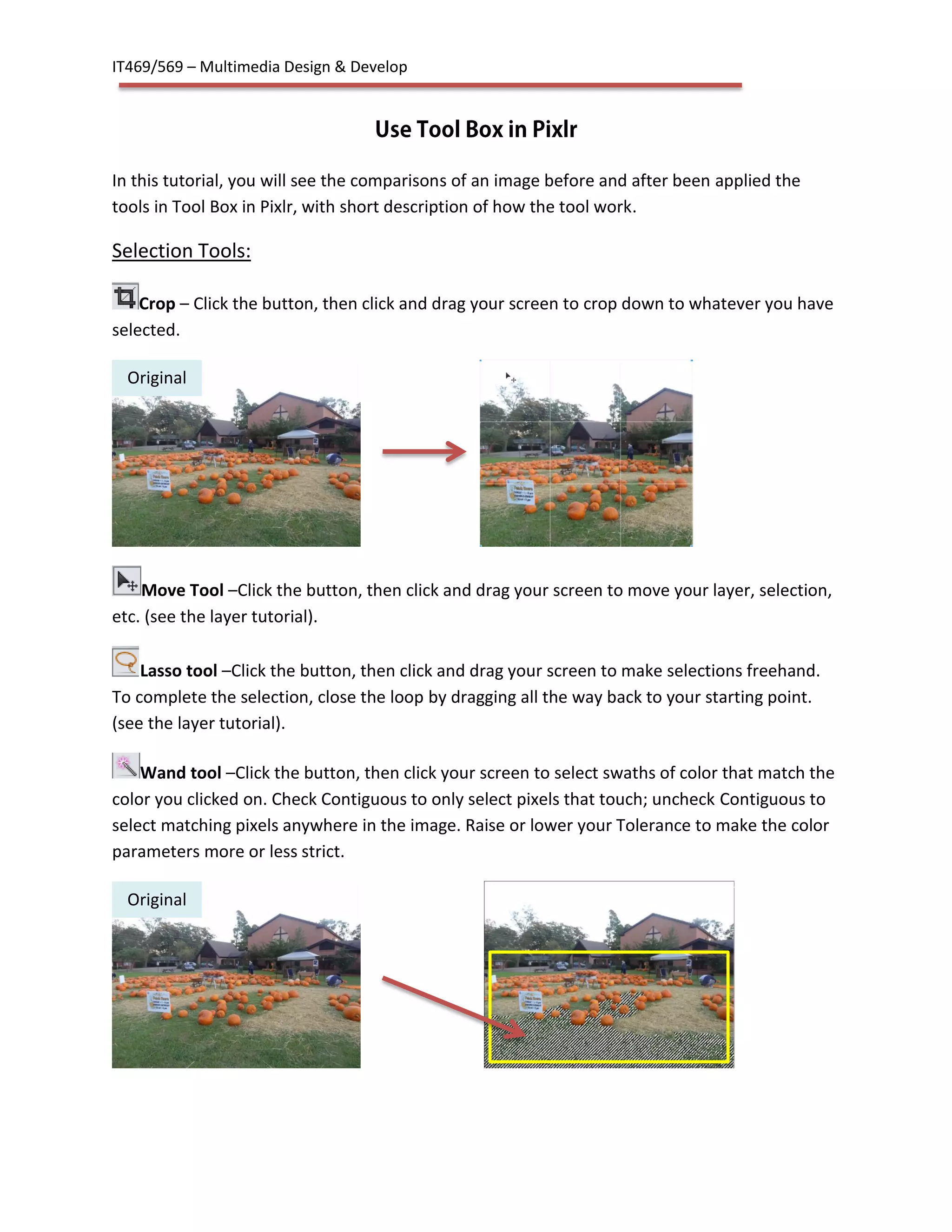 This document provides a tutorial on using Pixlr's multimedia design tools, detailing various selection, editing, blending, and special effect tools. It explains how to use specific tools like the crop, lasso, pencil, and paint bucket tools for image manipulation. Additionally, it describes adjustments like blurring, sharpening, and using the color picker for image enhancement.