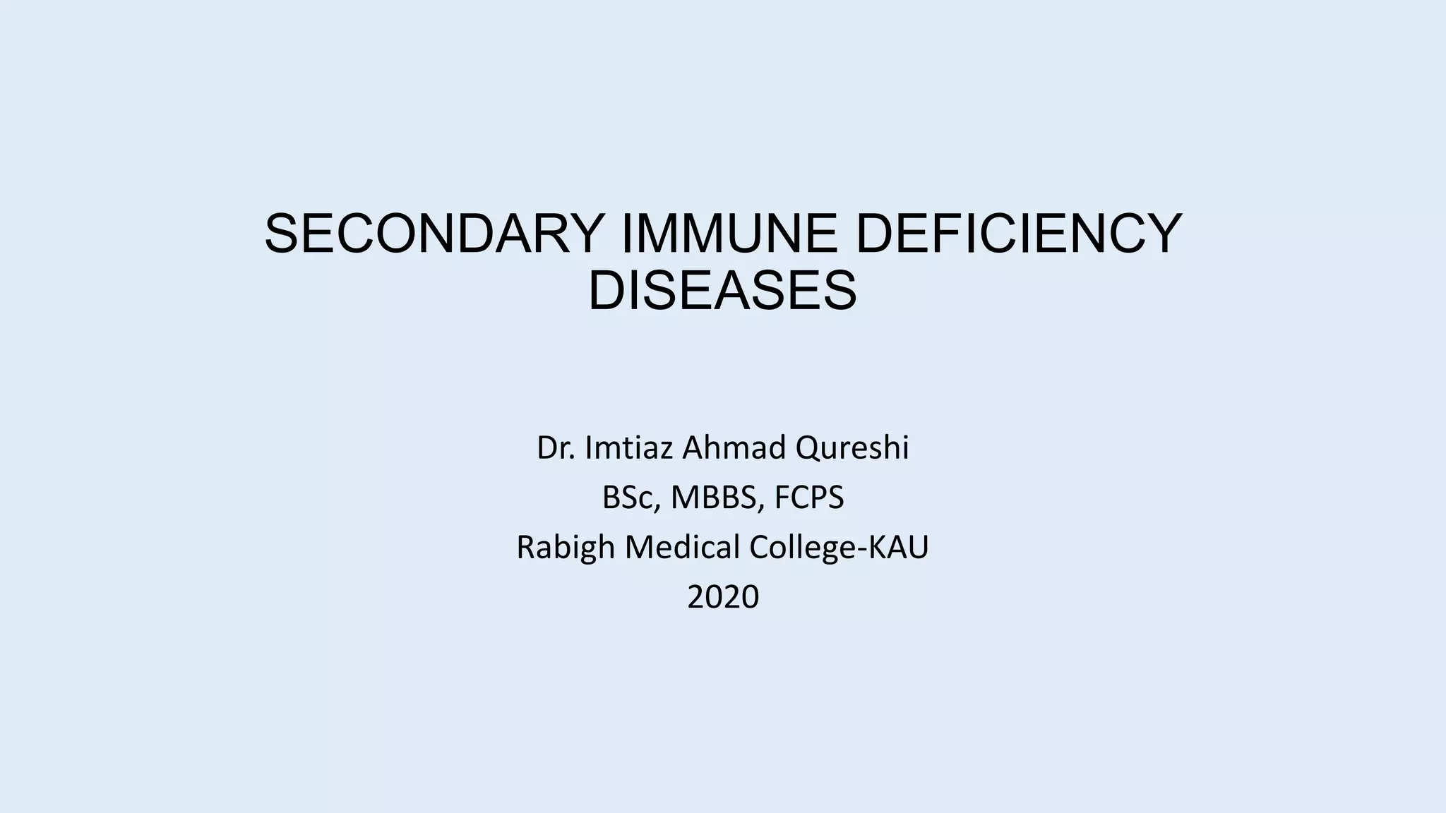 This document defines secondary immune deficiency diseases and discusses HIV/AIDS in particular. It covers the causes, pathogenesis, clinical presentations, diagnosis, and monitoring of secondary immune deficiencies, with a focus on HIV. Key points include: (1) Secondary immune deficiencies are acquired and common, caused by defects in antibodies, phagocytes, complement, or cell-mediated immunity; (2) HIV progresses through early, chronic, and crisis phases defined by declining CD4+ T-cell counts; (3) AIDS is diagnosed when CD4+ counts fall below 200 cells/μL and opportunistic infections or cancers develop.