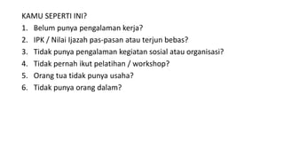 Dokumen memberikan panduan lengkap untuk membuat surat lamaran kerja dan CV yang efektif, meliputi proses eliminasi untuk menentukan posisi yang tepat, menghubungkan kualifikasi dengan kebutuhan pekerjaan, dan langkah-langkah menulis surat lamaran kerja mulai dari bagian pembuka, inti, hingga penutup beserta contohnya.
