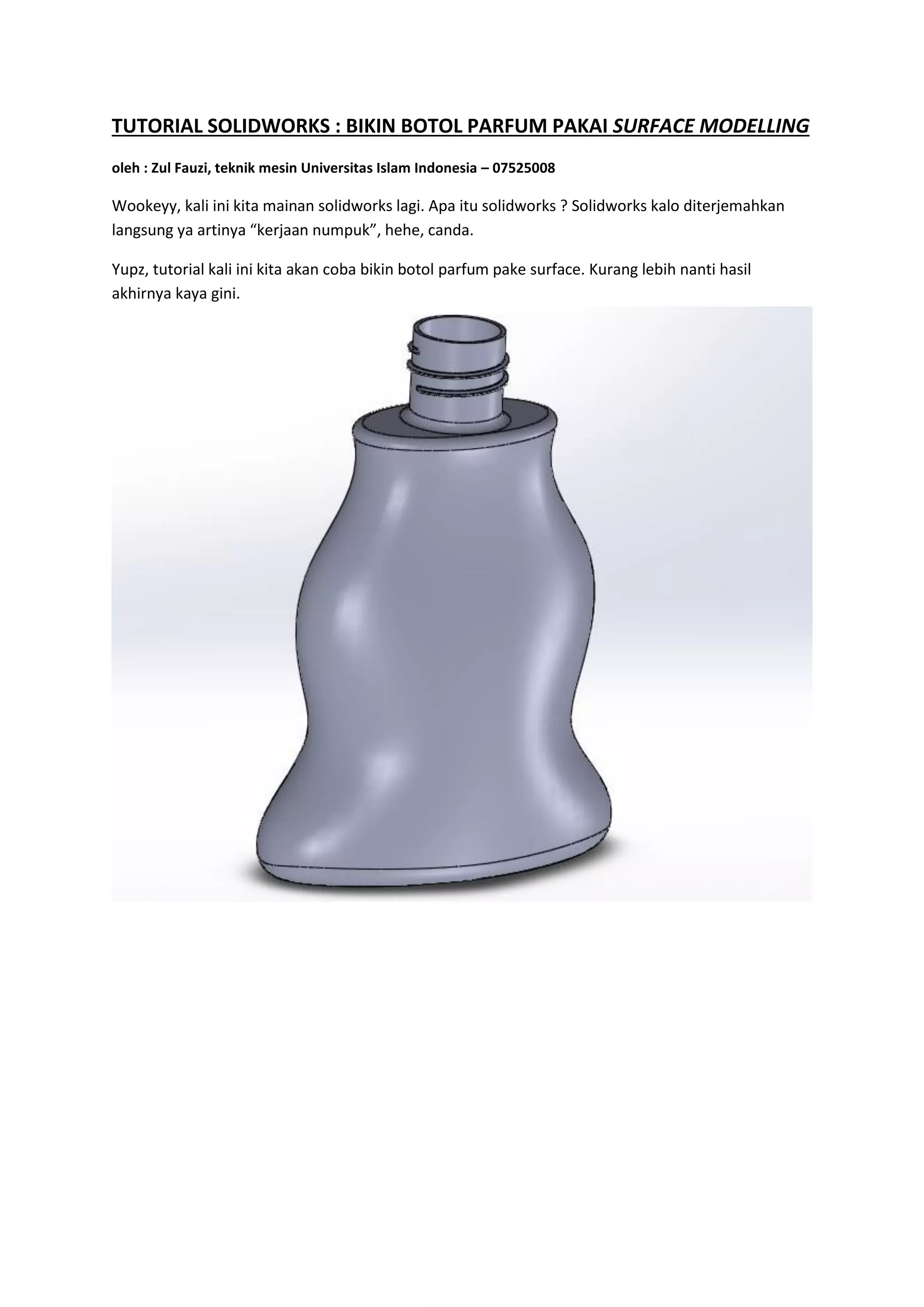 Dokumen ini adalah tutorial penggunaan SolidWorks untuk membuat desain botol parfum menggunakan teknik surface modeling. Langkah-langkahnya mencakup pembuatan geometris dasar, penyesuaian lekukan, penggabungan surface, dan penambahan elemen ulir pada bagian moncong botol. Tutorial ini juga memberikan arahan untuk menambah ketebalan pada botol yang baru selesai dibuat.