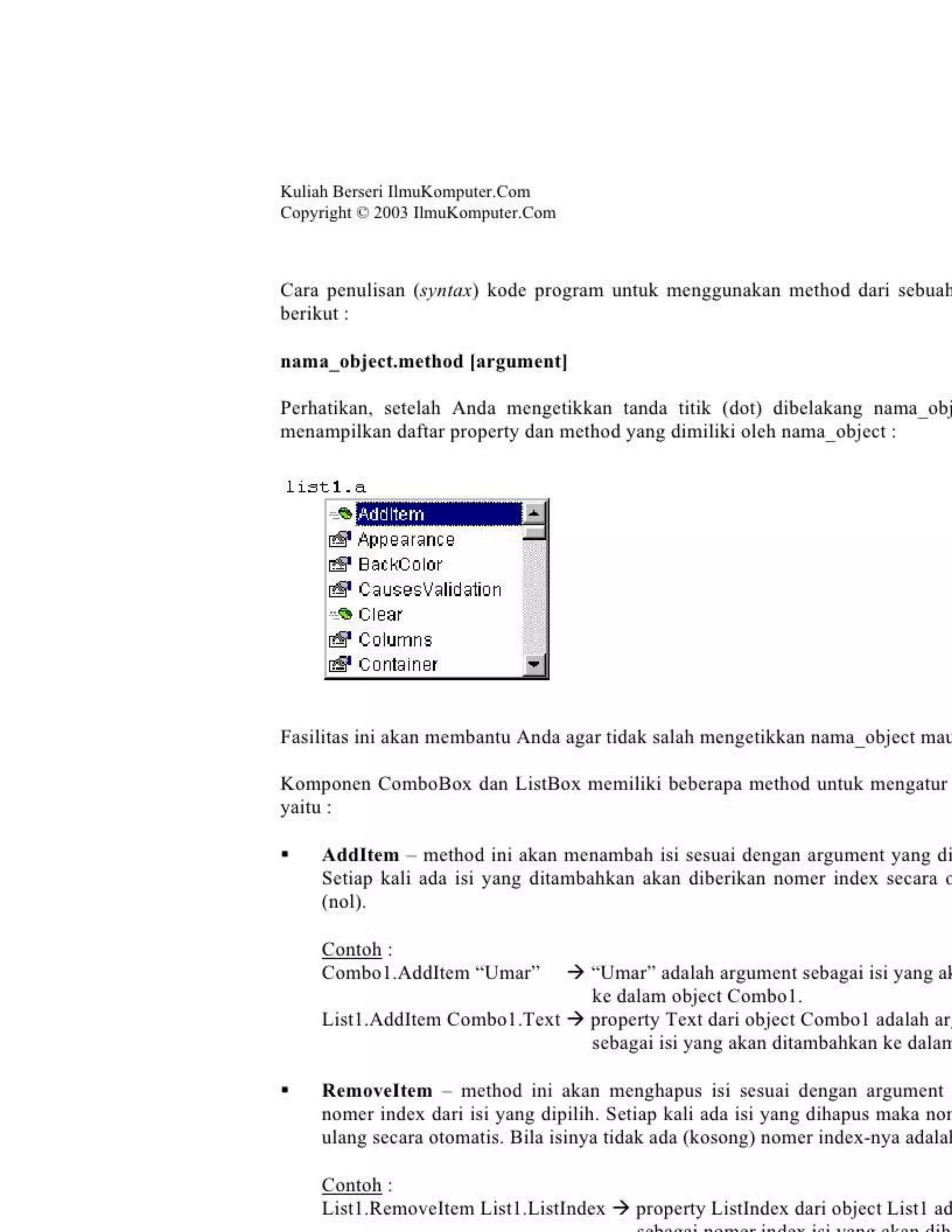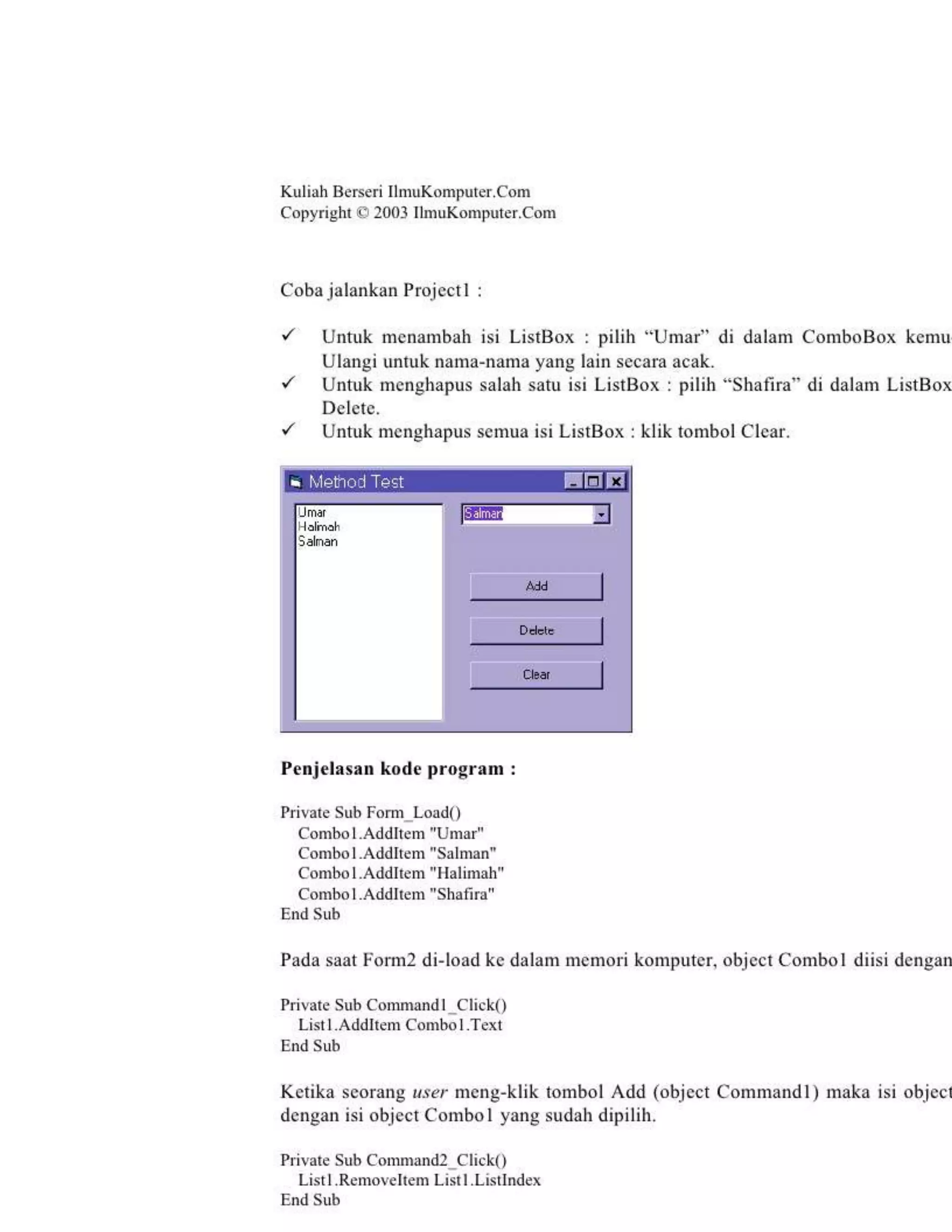 2. Terdapat penjelasan tentang cara membuat antarmuka pengguna, mengatur property objek, menulis kode program untuk event klik tombol, dan contoh kode untuk menambahkan dan menghapus item pada list box.
