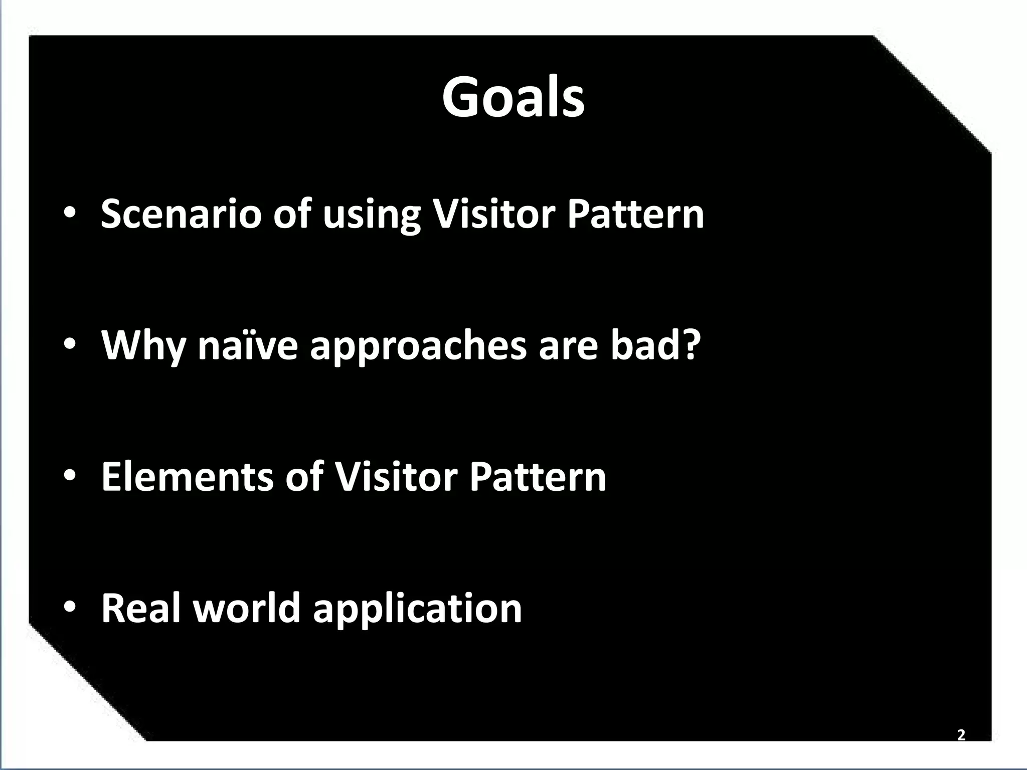 This document discusses the visitor pattern. It begins with an example scenario of using the visitor pattern to find Lady Gaga fans among students, professors, and staff. It then discusses naive approaches that have problems and are not object-oriented. The document explains the elements of the visitor pattern solution, including how it separates the algorithm from the class structure. Finally, it provides an example of using the visitor pattern in compiler design with the Eclipse JDT and how the AspectJ compiler reuses elements from JDT. The key benefits are allowing new operations to be added without changing existing classes and making compilers extensible.