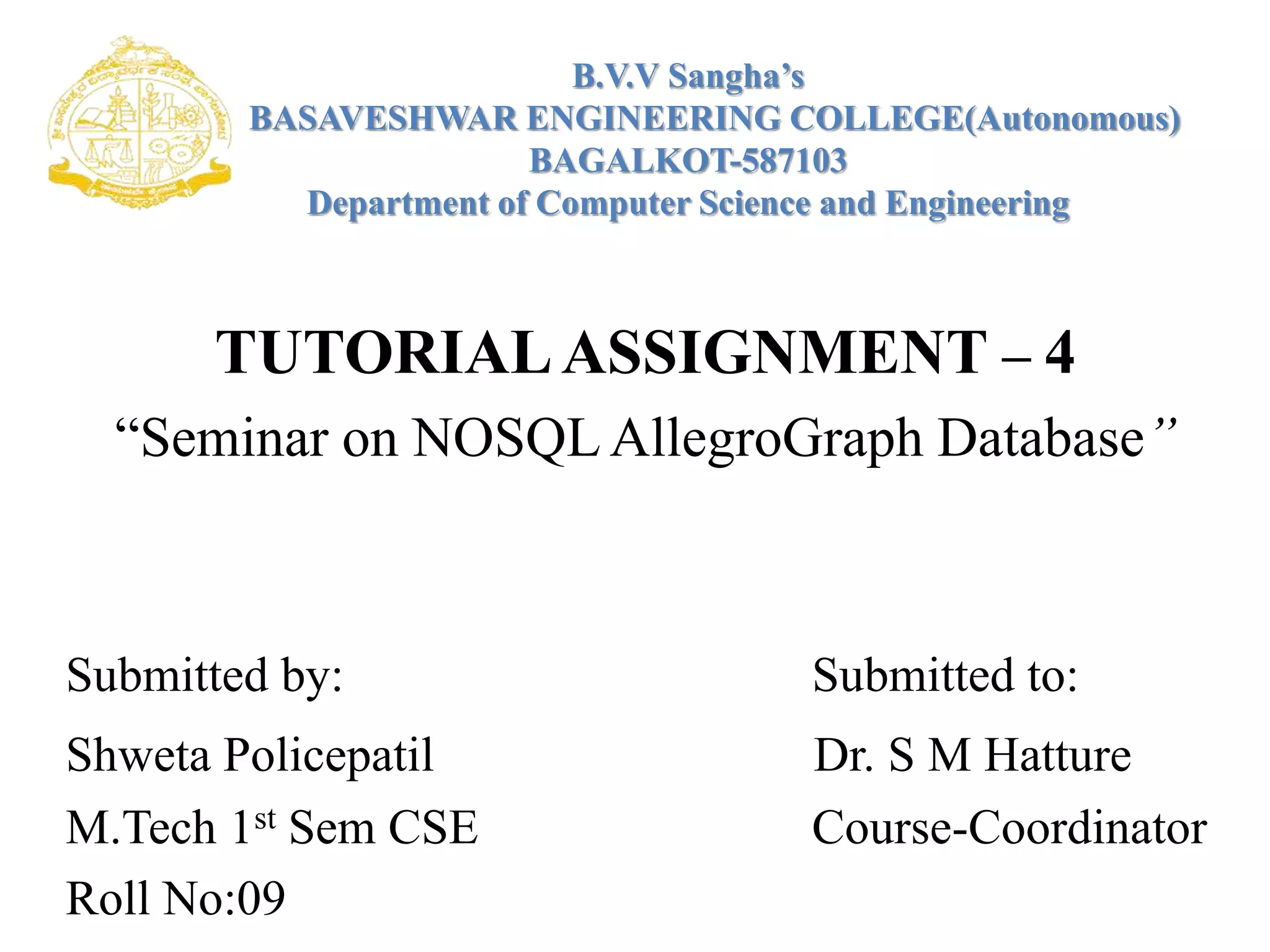 AllegroGraph is a graph database and semantic web application framework. It stores data in triples that describe resources and relationships. AllegroGraph provides high performance, scalability, and supports standards like RDF, RDFS, and SPARQL. It offers features like ACID transactions, read/write concurrency, dynamic indexing, and resource management. AllegroGraph has been used in commercial and open source projects including social networking, logistics, and network analysis applications.