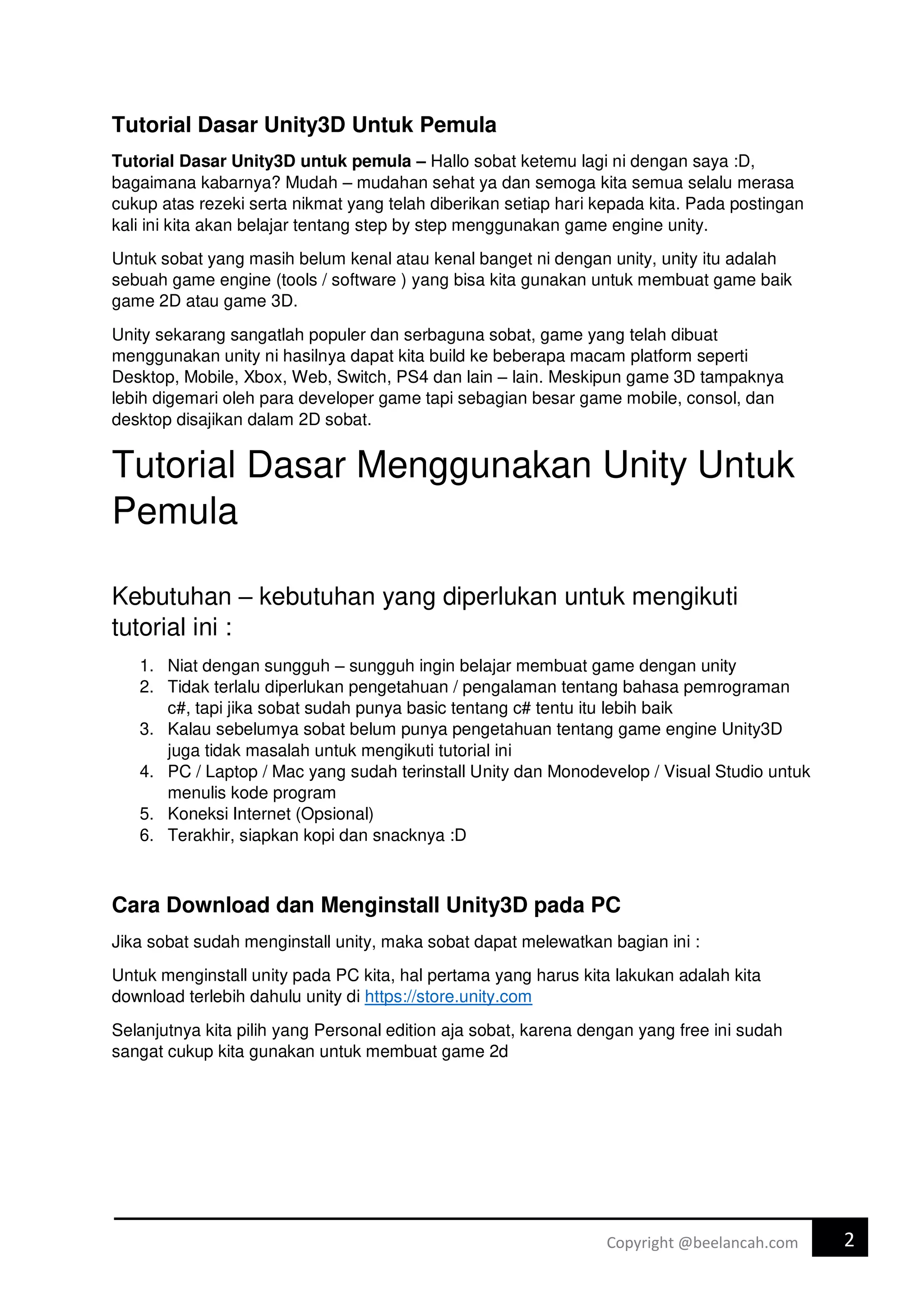 Dokumen ini adalah tutorial dasar untuk pemula dalam menggunakan game engine Unity, memberikan panduan langkah demi langkah untuk menginstal, mengatur proyek, dan membuat game sederhana. Terdapat juga penjelasan tentang komponen-komponen penting di dalam Unity dan dasar pemrograman C#. Penulis berharap tutorial ini membantu pembaca memulai perjalanan mereka dalam pengembangan game dengan Unity.