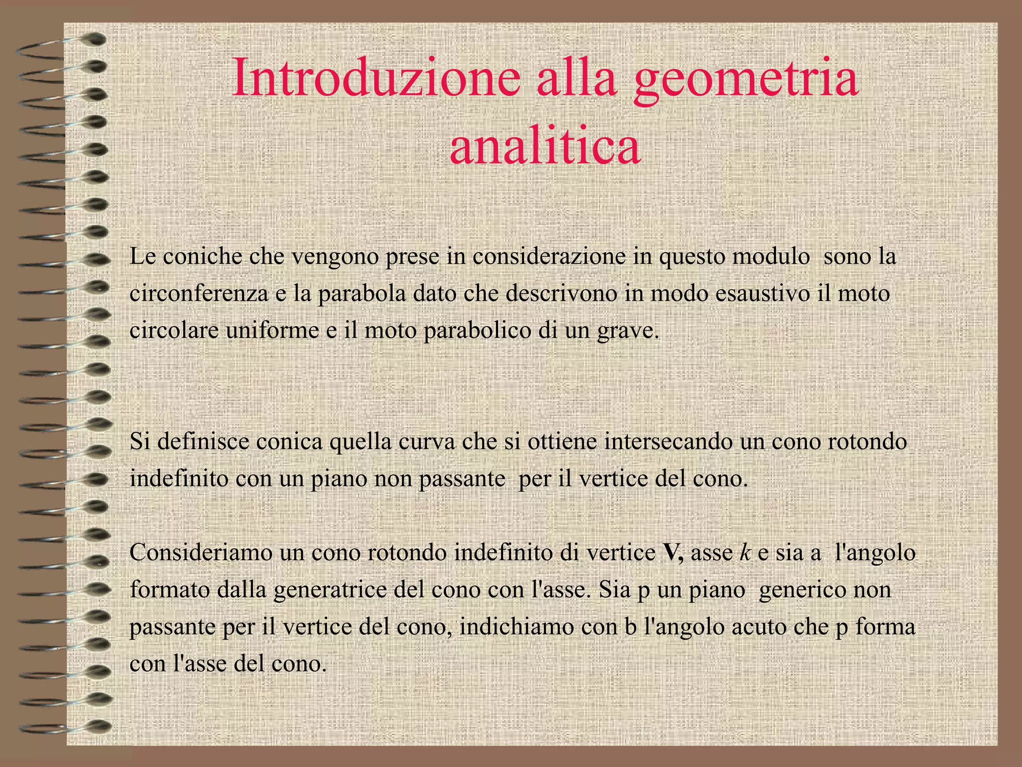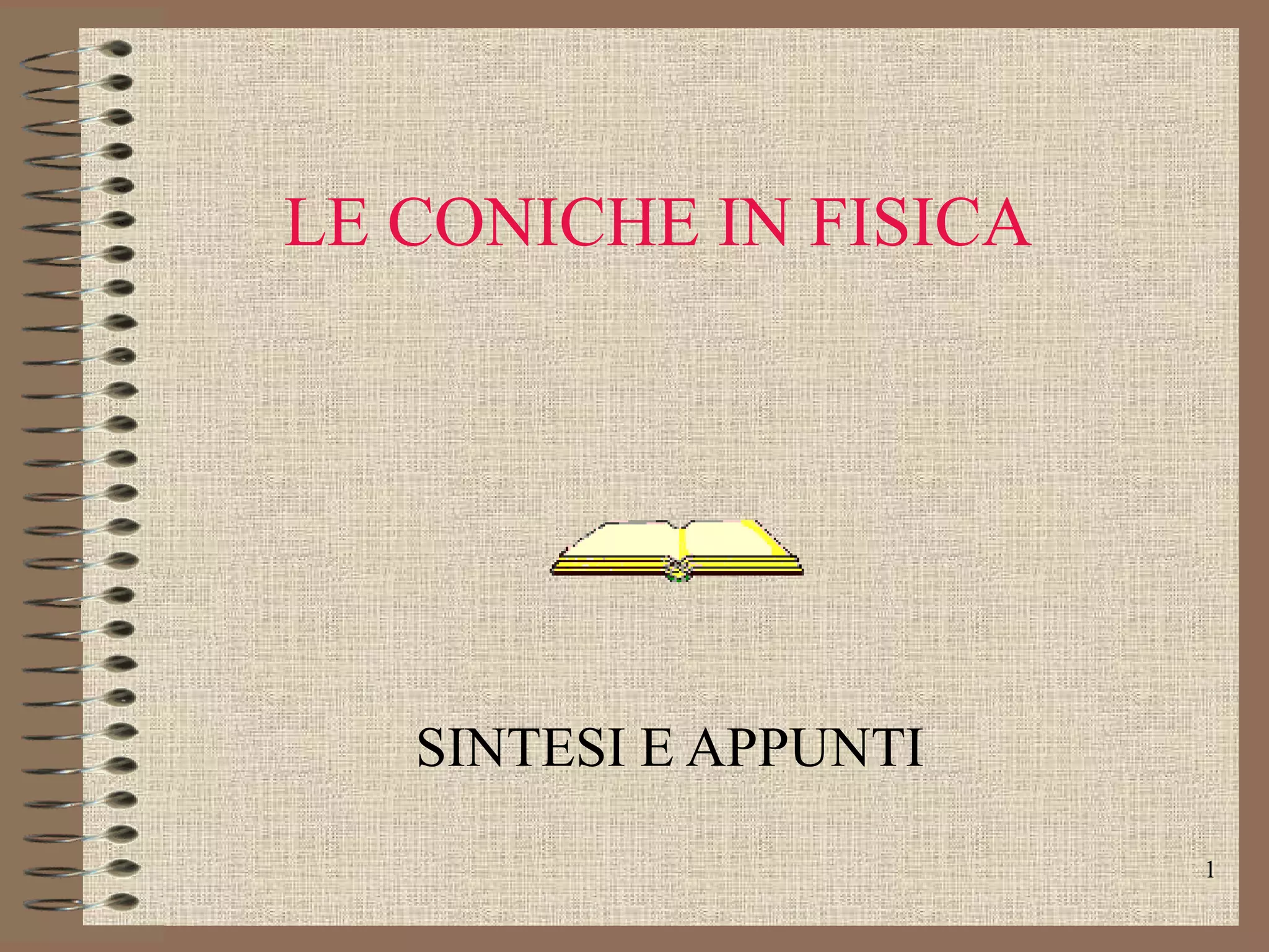 Il documento tratta delle coniche in fisica, concentrandosi sulla circonferenza e la parabola, che descrivono rispettivamente il moto circolare uniforme e il moto parabolico. Viene spiegato come le coniche siano generate dall'intersezione di un cono con un piano e si discute la loro rappresentazione tramite equazioni quadratiche. Infine, il documento analizza le applicazioni fisiche delle coniche, descrivendo il moto nel piano utilizzando sistemi di riferimento cartesiani e polari.
