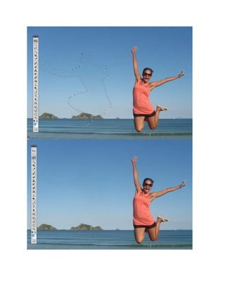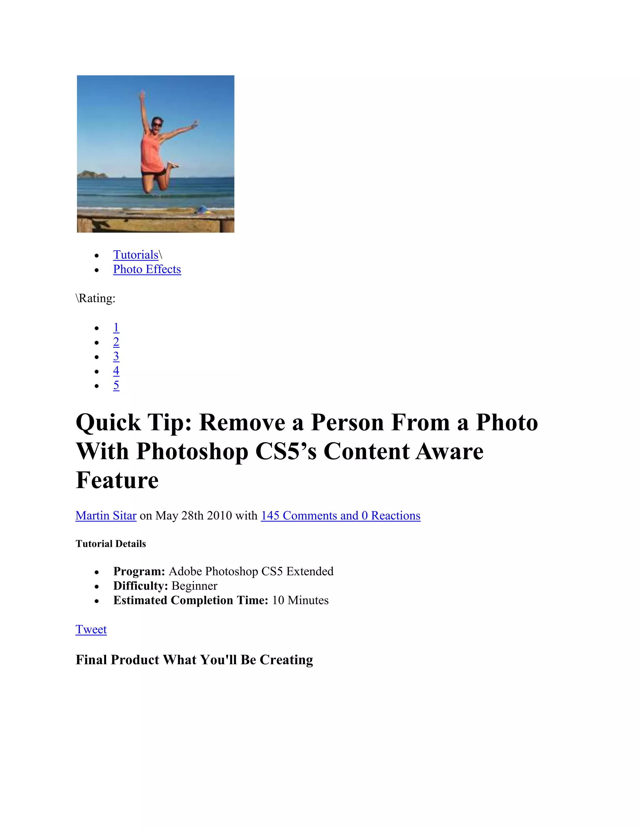 This tutorial demonstrates how to remove a person from a photo using Photoshop CS5's Content Aware feature. The tutorial uses an image of two people on the beach. It provides steps to select the person to remove using the pen tool, fill the selection with Content Aware to remove the person, and then enhance the photo by adjusting color curves. The entire process takes less than 10 minutes.
