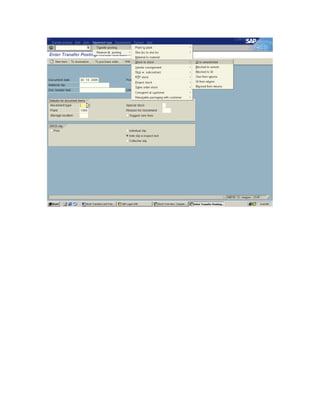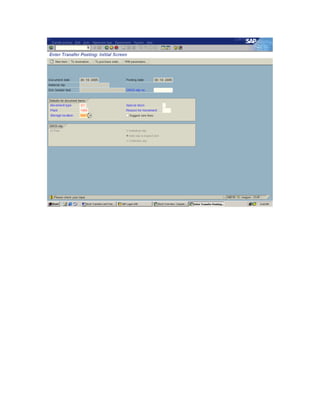 Stock transfers can occur between different stock types, materials, storage locations, and plants. The document describes various scenarios for transferring stock, including checking the material document, accounting documents, and stock overview after each transfer. Transfers can be done simultaneously between plants or by issuing from one plant and receiving at another. When using the MM interface, material must be maintained at the issuing plant with sales information and a customer created for the receiving plant, then a PO is made at the receiving plant.