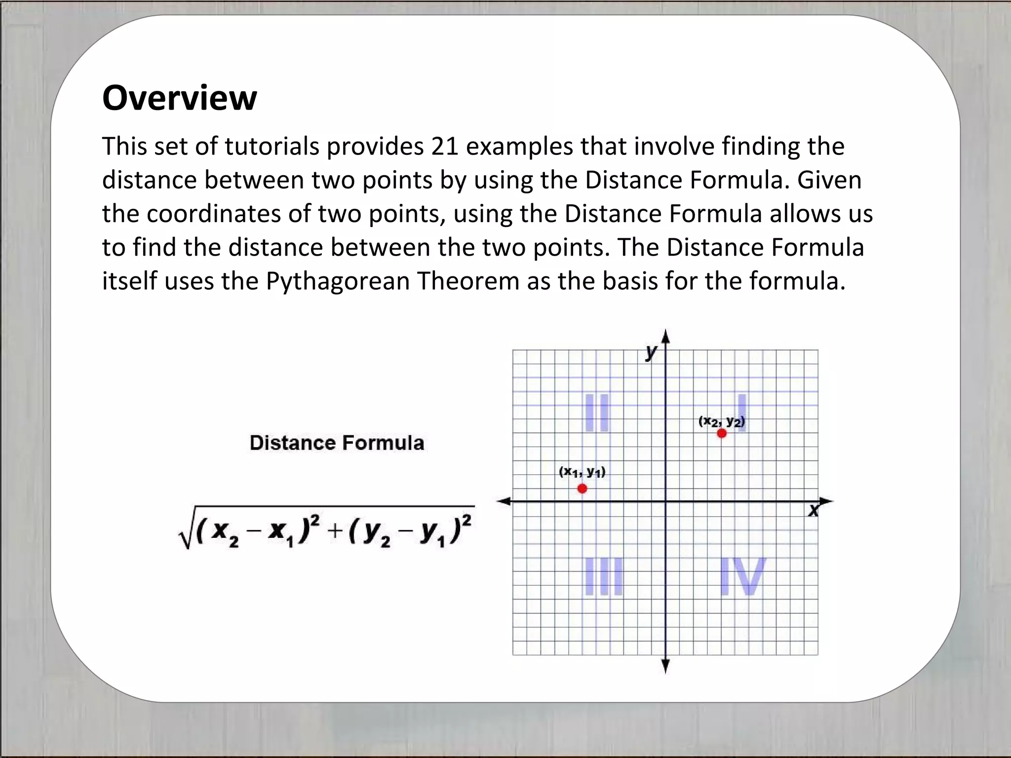 This document provides 21 examples of using the Distance Formula to calculate the distance between two points with different coordinates. The Distance Formula uses the Pythagorean Theorem as the basis for finding the distance between any two points given their x- and y-coordinates. Each example solves for the distance between points located in different quadrants or along the x- or y-axis.